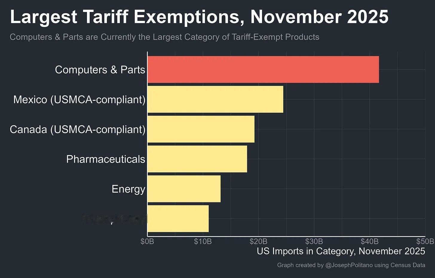 特朗普关税中,对计算机及其部件这类构成 AI 训练和推理基础设施核心的进口产品,实施了关税豁免。