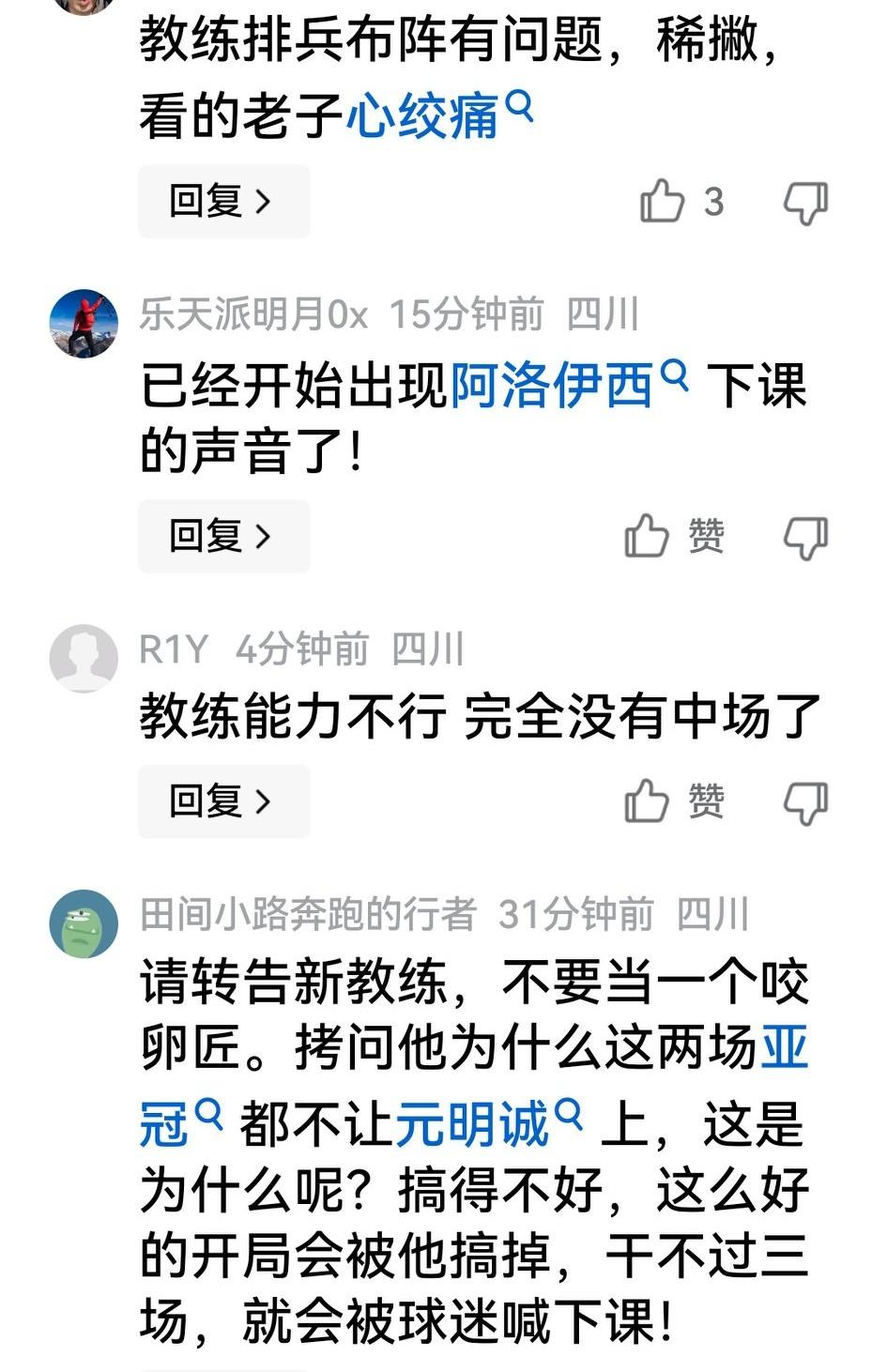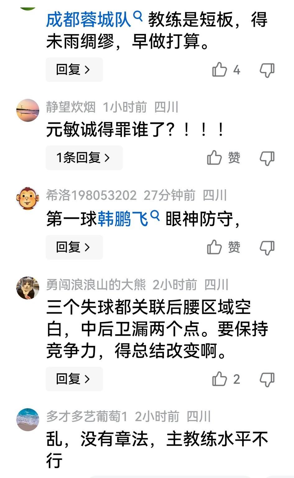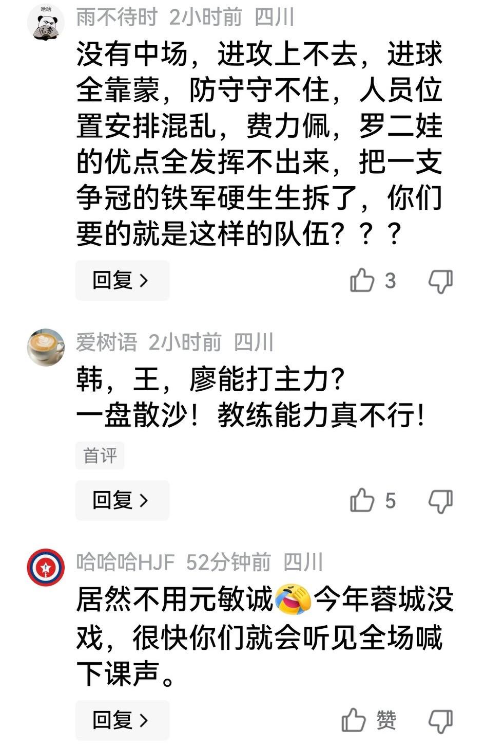 成都蓉城亚冠输球在意料之中,按理说在阵容不整时能在客场与町田打2:3,球迷都能接受,但不少人在俱乐部官微评论区还有话说: 一是对阿洛伊西的执教能力似有不服,期望早备后手;二是质疑韩韩飞廖力生王东升3位废弃老将新瓶装老酒,同情元神(元诚敏)的遭遇;三是刘殿座已7多场没了神扑,“射正亡”的称号该给老刘…… 当然,两场亚冠都阵容不整,小比分输球不算什么,但在降本增效不成立情况下,希望阿洛对球员的能力潜力有深入了解,在联赛中不要乱点鸳鸯谱。