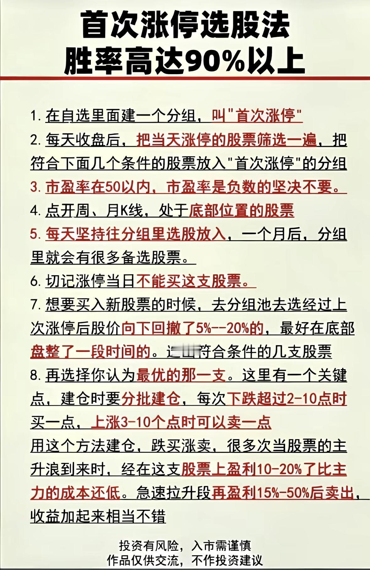 听说过 90%胜率首次涨停选股法吗?这听起来简直是炒股秘籍啊!想象一下,要是真能有这么高胜率,那在股市里不得赚得盆满钵满。 不过,这方法真有这么神吗?我觉得不能全信。股市变幻莫测,哪有什么方法能保证 90%的胜率。之前就有朋友轻信所谓的选股秘籍,结果赔得一塌糊涂。 就算这方法有一定道理,也得结合市场情况、公司基本面等因素。而且首次涨停也不代表后续就一定涨。所以啊,炒股还是得谨慎,不能盲目依赖这些所谓的秘籍。