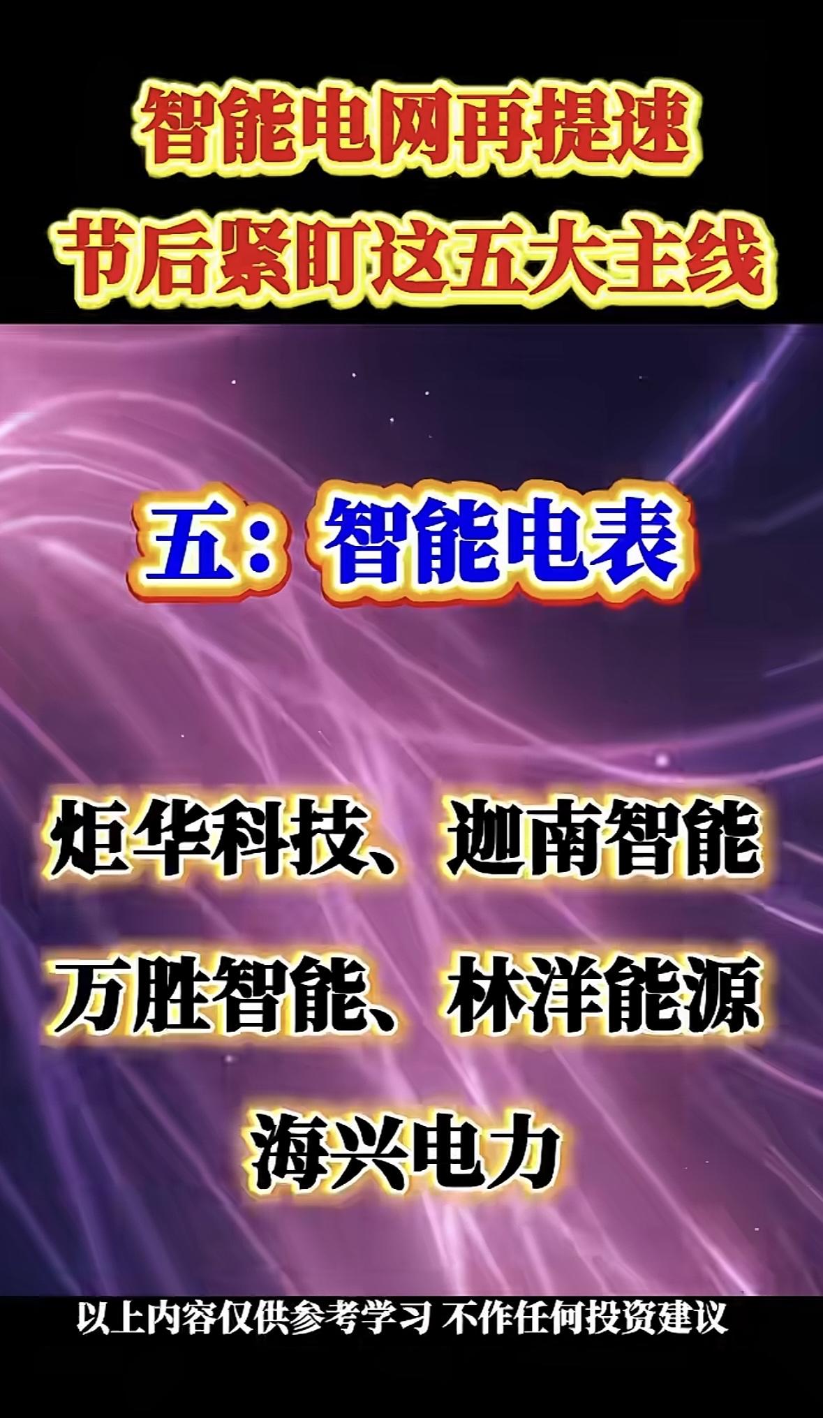 节后投资啥?智能电表五大主线得关注! 从产业角度来看,随着能源结构调整和数字化升级,智能电表需求大增。第一,技术创新线,新型电表功能不断升级,像高精度计量、远程通信等技术发展迅猛。第二,政策支持线,国家对智能电网建设大力扶持,为智能电表市场提供了广阔空间。第三,市场需求线,工商业和居民用电管理智能化需求,推动电表更新换代。第四,企业竞争线,头部企业凭借技术和规模优势抢占市场。第五,行业融合线,与物联网等融合创造新应用场景。抓住这五条线,说不定能抓住新的投资机遇,实现财富增值。
