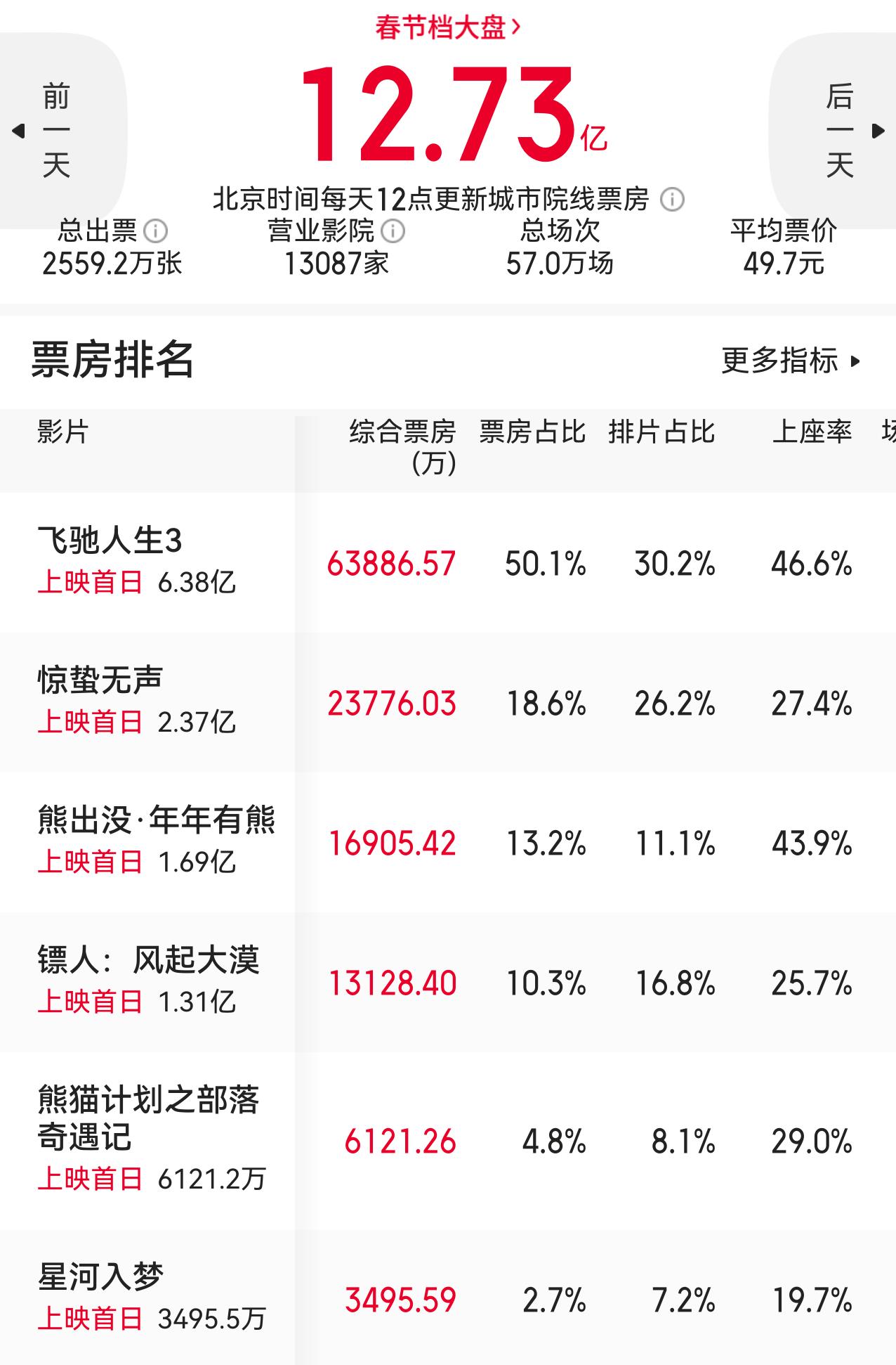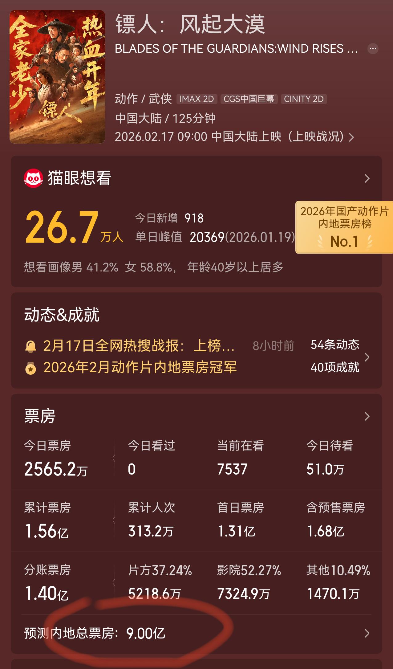 一早起来,发现《镖人》已经彻底失去了回本的希望! 昨天大年初一,韩寒导演的《飞驰人生3》,以6亿3000多万的成绩排在第一,之前呼声极高的电影《镖人》只排在第四,还不及《熊出没》!让人大跌眼镜! 今天一早看数据,《飞驰人生》票房又已经达到了1.2亿,预测总票房超过50亿!而《镖人》预测总票房才9亿,离回收成本15亿彻底无望! 之前我还预计,《镖人》宣传这么给力,主演阵容也强大,但是完全没想到,竟然遭遇如此大的滑铁卢! 我估计这两天吴京整夜难免,如果最终票房只有9亿,那么他们分账只有3亿多,据说这部戏的成本是5个亿,这样算下下来,整部片子要亏约2亿。 吴京的登峰国际作为最大资方,亏得也最多。最重要的是,这次将彻底打破吴京的“神话”,也彻底跌落神坛。他以后说话估计再也不会摇头晃脑了!
