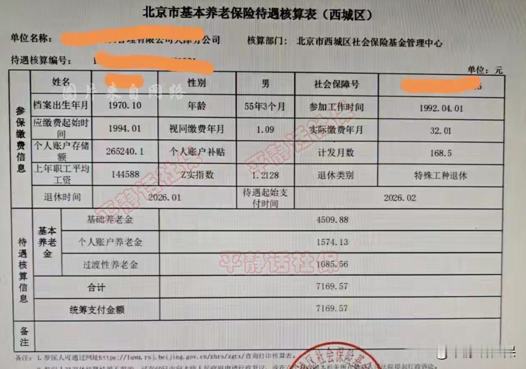这是一位北京退休老哥的疑问,搞不清楚表中的过渡性养老金是怎么来的? 简单介绍一下,男性,1970年10月生人,2026年2月退休,特殊工种退休,退休时年龄是55岁3个月。1992年4月参加工作,1994年1月开始缴费,视同缴费1年9个月,实际缴费32年1个月,指数1.2128,个人账户本息累计26.52万。 养老金的核定结果为:基础养老金4509.88元,个人账户养老金1574.13元,过渡性养老金1085.56元,三项合计7169.57元。 前两项没有任何疑问,老哥疑惑的是第3项过渡性养老金是怎么来的? 按照北京过渡性养老金的计算方法,他的过渡性养老金分为两段: 1、1992年4月到199493年12月,共1.75年。2、1994年1月至1998年6月,共4.50年。 但由于是特殊工种退休,存在特殊工种折算年限 第1段1.75年折算后为2.1875年,第2段4.50年折算后为5.625年。 再按照北京的养老金计算公式. 第一段:12049*1*2.1875*1%=263.58元 第二段:12049*1.2128*5.625*1%=821.98元 两项共1085.56元,则刚好对得上表中的数。 因此可以判断,这位大哥从事的是高温井下1.25的折算系数。 个人分析,仅供参考。