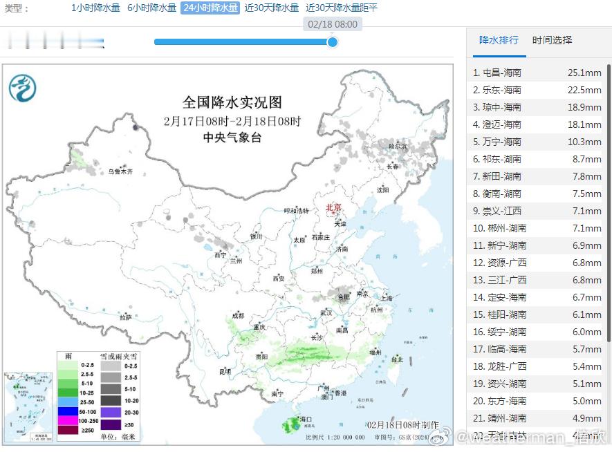 【雨雪】昨天到今晨,我国降水总体缩减。海南的降雨增多,多地出现中雨,其中,屯昌25.1毫米,出现了当地今年首场大雨。此外湖南等地出现小雨。在吉林、黑龙江部分地区出现降雪。