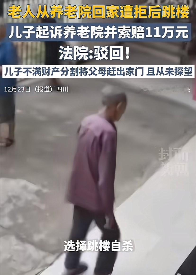 四川成都,老人在养老院看电视想换台,被工作人员拒绝,几天后一个人离开养老院,来到儿子家中,但无论怎么敲门儿子都拒绝开门,老人甚至报警求助,未果后,跳楼身亡。事后,老人老伴儿和儿子不愿意了,认为是养老院拒绝换台,让老人精神受辱,才想不开自寻短见,要求养老院赔偿11万元。法院这样判! 老人姓袁,八十多岁,和老伴一起住在成都某养老院。 那天是夏天的一个傍晚,养老院餐厅里摆着几十张桌子,很多老人围着吃饭。 大家一边吃饭,一边看电视,当时播的是一部热播剧。 袁大爷喜欢看乒乓球比赛,觉得奥运四年一届,难得一遇。 他开口说能不能换到体育频道。 工作人员没同意,说公区电视要顾及大多数人的喜好。 还建议袁大爷可以把饭端回房间吃,那边的电视随便看。 话说得中规中矩,但语气里没有讨好,也没多安慰。 坐在旁边的老伴其实比他更着急,直接向工作人员提出换台。 几句话吵了起来,最后还是没换成。 袁大爷全程几乎没说话,只是背对着电视坐着,动作变得缓慢,眼睛盯着碗。 没人知道他心里那一刻在想什么。 过了几天,袁大爷悄悄收拾了几件衣服,一声不响地离开了养老院。 他的目标只有一个,就是去找儿子。 他一路坐公交,打听门牌号,早晨七点不到就出现在儿子家楼下。 站在门口,他敲了门。 说自己想回家看看,想喝口水,说自己可能没几天好活了。 门关着没人应声,敲了五分钟、十分钟,仍旧没有人出来。 邻居隔着楼层听见了声音,说这个老人在苦苦哀求自己的儿子开门。 原来,袁大爷以前把房子留给了一个远房亲戚的孩子。 他的亲儿子袁乙因为这件事心里有怨气。 两人还签了断亲协议,从此各过各的。 养老院就是那之后安排的,因为儿子不再愿意照顾。 门一直没开,袁大爷坐在楼道里,攥着手里那把早就作废的钥匙。 他报了警。 对接线员说自己老了,回不了养老院,也进不去家门,没地方去了。 派出民警来了以后,儿子仍然没开门。 民警在门外劝了一阵,得到的回应还是冷冰冰的一句,家里不欢迎他。 直到上午十点半,一声闷响,袁大爷从楼上跳下,结束了自己的生命。 这之后,他的儿子和老伴把养老院一纸诉状告上了法庭。 他们说老人的死和那次换台事件脱不了干系,要求养老院赔十一万元。 说那天老人面子挂不住,尊严受损,才一步步走向极端。 养老院拿出了详细的监控画面和服务记录。 工作人员确实没有辱骂,也没有强硬驱赶老人。 换不了频道是因为多数老人正在看,不是针对某一个人。 工作人员还当晚主动对老人表达歉意,也约定之后会再安排转播乒乓球。 法院最终判决,养老院管理方式没有过错,拒换台属于合理管理行为。 拒绝赔偿,也没有承担责任的法律依据。 判决明确,这次悲剧的根源,并不是一个电视频道,而是家门始终不开。 更不是养老院被动承担的那几句话,而是多年留存的家庭裂痕。 值得注意的是,健康信息登记时,袁大爷一方没有透露老人的抑郁病史。 这导致养老院以普通老人的标准对他看护,无法进行特别的心理干预。 从法律角度来说,老人自杀的决定发生在养老院之外。 养老院既未违约,也不存在失职,更无安全管理疏漏。 法院查阅的还有另一份证词,是袁大爷孙女提供的。 她回忆爷爷事发前有打电话,说可能真的活不下去了。 电话里儿子还在讲他为什么不能原谅老父亲,把家里的房子给别人。 她说,当时爷爷听完以后沉默了很久。 很快,这通电话就成了爷孙之间的最后通话。 舆论对这场案件议论纷纷,有人站在养老院立场,有人指责袁乙不孝。 也有人分享了自己的经历,说父母强留房产给他人,自己难当孝子。 各种声音背后,反映出的是一种共通的担忧。 老人年纪大了之后,最怕的不是吃穿用度,而是孤独和被否定。 亲情一旦断开,生命的最后时刻,就会变得异常寒冷。 但话说回来,类似断绝关系协议即便签了,在法律上并不构成亲情的终止。 就算再冷的父子关系,子女也有赡养的义务,法律条文写得很清楚。 哪怕父亲已将房产尽赠他人,成年子女不履行赡养,依旧会受到追责。 养老院能提供床位、药物、照料,却替代不了一扇真正愿意为老人打开的家门。 至于这起案子的赔偿主张,是法院通过调查后严格依法进行了驳回。 有人可能有不同看法,认为换台就是导火索。 也有人发现问题根本在家庭冷漠。 你怎么看? 欢迎在评论区说说你的观点。