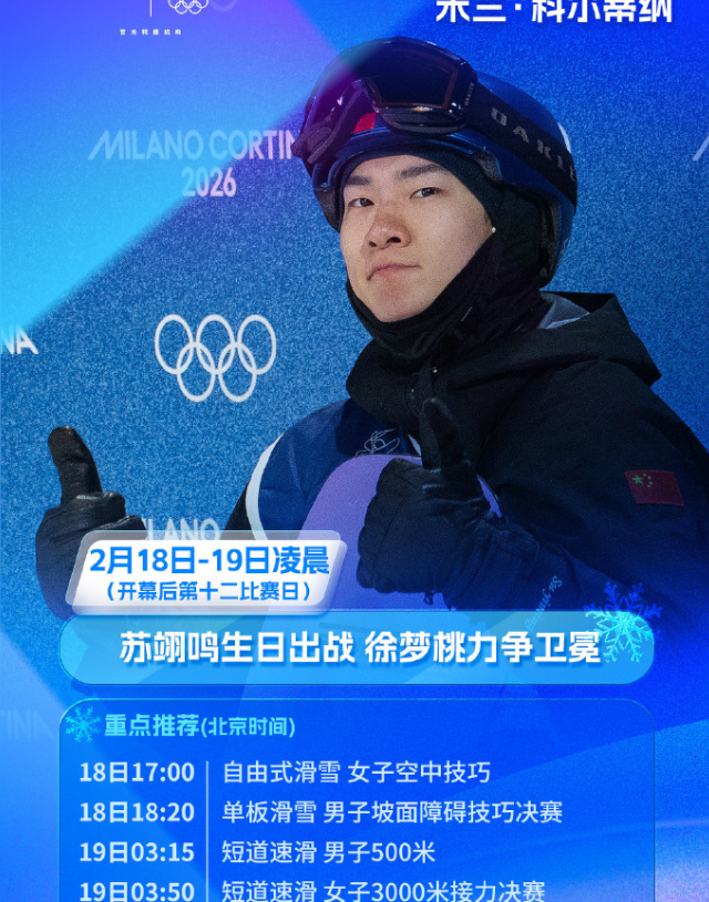 北京时间2月18日下午,2026年冬奥会迎来开幕后的第十二个比赛日,这个比赛日中国选手将参加多个项目的角逐。自由式滑雪女子空中技巧项目预赛与决赛均在今日举行,徐梦桃将迎来自己的卫冕之战,此外还有陈梅婷、孔凡钰、邵琪三位中国选手参赛;在今天迎来22岁生日的苏翊鸣将出战单板滑雪男子坡面障碍技巧决赛;短道速滑男子500米刘少昂、林孝埈将携手出战;中国队还将出战短道速滑女子3000米接力决赛。让我们一起为中国冬奥健儿加油!