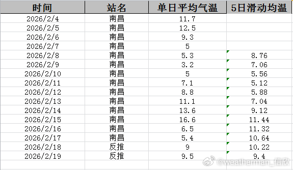 南昌在2月13-15日迎来春日,但之后降温返冬。从5日滑动均温看,反推2月15-19日的5天组应该会低于10℃,因此上次入春尝试大概率失败。不过20日-22日明显升温,之后尽管还有冷空气影响,但降温不会很剧烈,入春无悬念。
