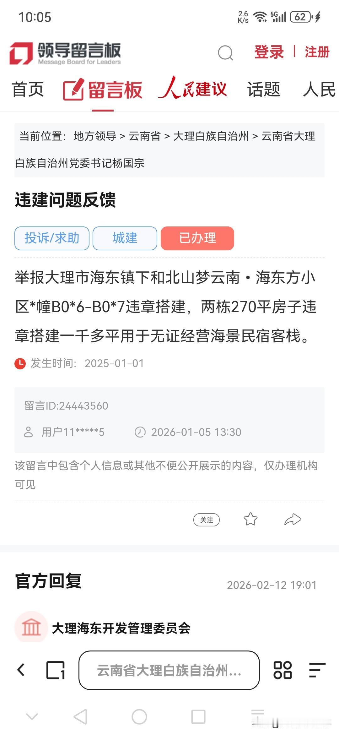 大理网民反映“海东方小区违建”的问题,经大理海东开发管理委员会系核实,海东方小区位于大理海东上和片区,海开委高度重视海东方违建管理工作,为管控好小区违建,海开委综合执法局安排巡山队每日不定期对小区违建进行巡查,发现违建立即干预叫停,并对涉及违建的协调物业管理公司对违建对违建户进行断水断电。 小区 违建房屋
