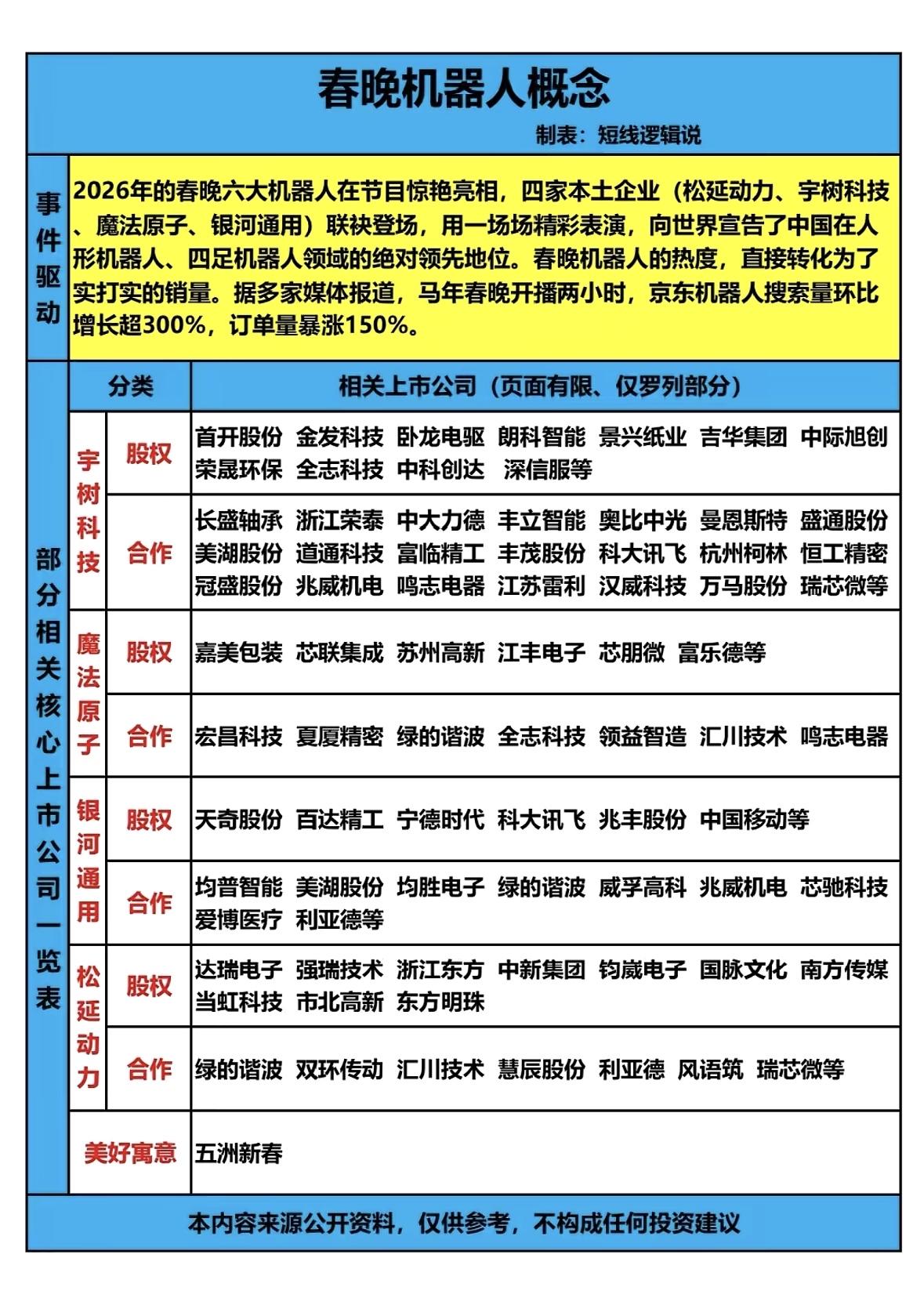 2026年春晚带火了机器人概念,不少人关注背后的A股上市公司。这里有几家值得留意。 宇树机器人的合作公司中,贝斯特是精密零部件制造龙头,为其提供高精度丝杠与传动部件;创世纪作为数控机床与智能制造装备龙头,提供精密加工设备与方案。 银河通用机器人的合作方里,均胜电子是汽车电子与智能座舱龙头,提供汽车级传感器与电子控制系统;博众精工也有相关业务。 另外,像魔法原子、松延动力、新松机器人等也都有各自的配套企业。不过要提醒,理财有风险,这些仅作行业科普,投资还得谨慎。