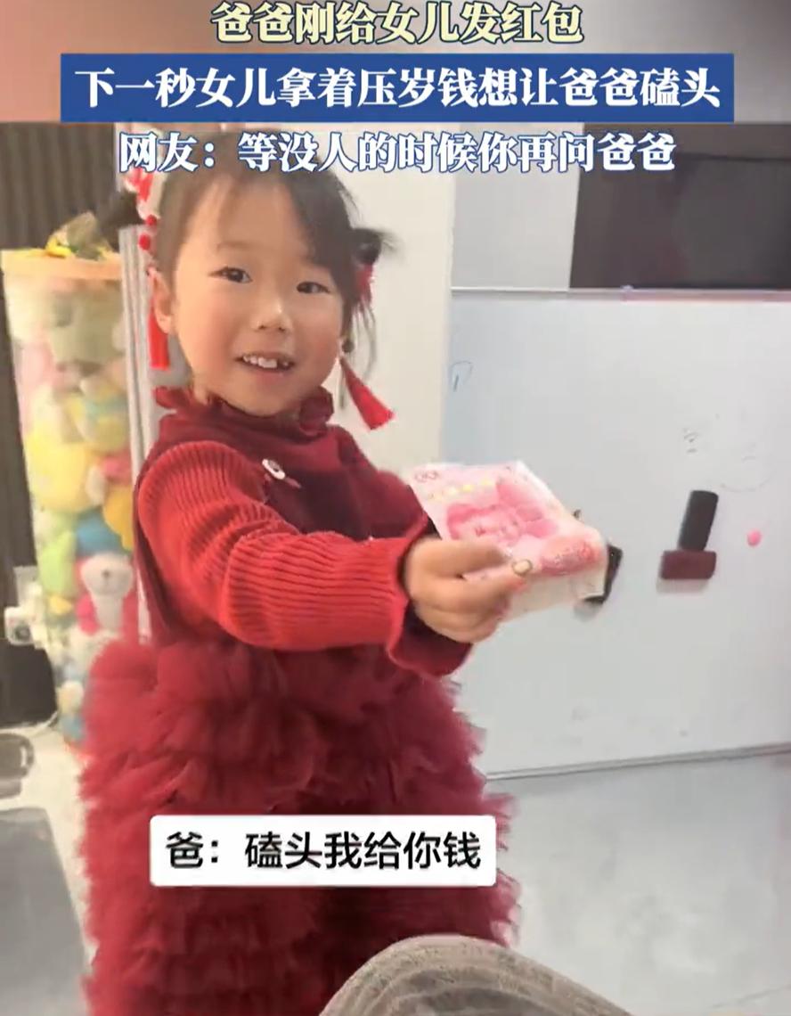 倒反天罡!河南,除夕夜妈妈给女儿拿了200块压岁钱,没成想,孩子把钱拿到手还没捂热乎,就直接走到爸爸旁边,让爸爸给自己跪下磕头拿钱,那一瞬间,爸爸甚至以为是自己听错了,而妈妈在旁边笑的眼泪都流出来了 当天,爸爸准备了200块钱,让妻子给女儿,自己则躺在一旁刷手机,谁知女儿接到钱后,直接把钱递给爸爸,张嘴就是一句:爸,你给我磕个头,这钱就归你了 妈妈在一旁听到后当场就笑了:你说啥,给谁磕头? 女儿笑了笑,拍了拍爸爸,让爸爸给自己磕头 这事儿搁谁身上都得愣三秒。当爸的准备了两百块让媳妇转交,自己躲清闲刷手机,谁能想到亲闺女转眼就给他来了个身份互换,让他给女儿磕头领钱 当爸的脸上挂不住,没搭理这茬,孩子还不依不饶地拽他,场面那叫一个热闹 有网友说:过年不打孩子,但这事除外 也有网友认为:童言无忌,解释一下给宝贝儿压岁红包的意义,她就可以明白啥意思以免发生其他人那里出现尴尬的问题了 这事乍一看是个熊孩子闹笑话,但细想一层,这恰恰说明了现在家庭关系的变化。搁二三十年前,哪家孩子敢让爹给自己磕头领钱?不挨顿揍都算过年烧高香了。那时候父子之间等级分明,爹就是天,孩子只有磕头的份,哪有讨价还价的余地 当然,教孩子懂规矩还是有必要的。磕头这种礼节,在咱的传统里是晚辈对长辈的尊重,方向不能搞反了。但这姑娘这份不怯场、敢表达的劲儿,其实也挺难得的。至少说明在这个家里,她活得舒展,没有那种见了爹妈就跟老鼠见了猫似的紧张感