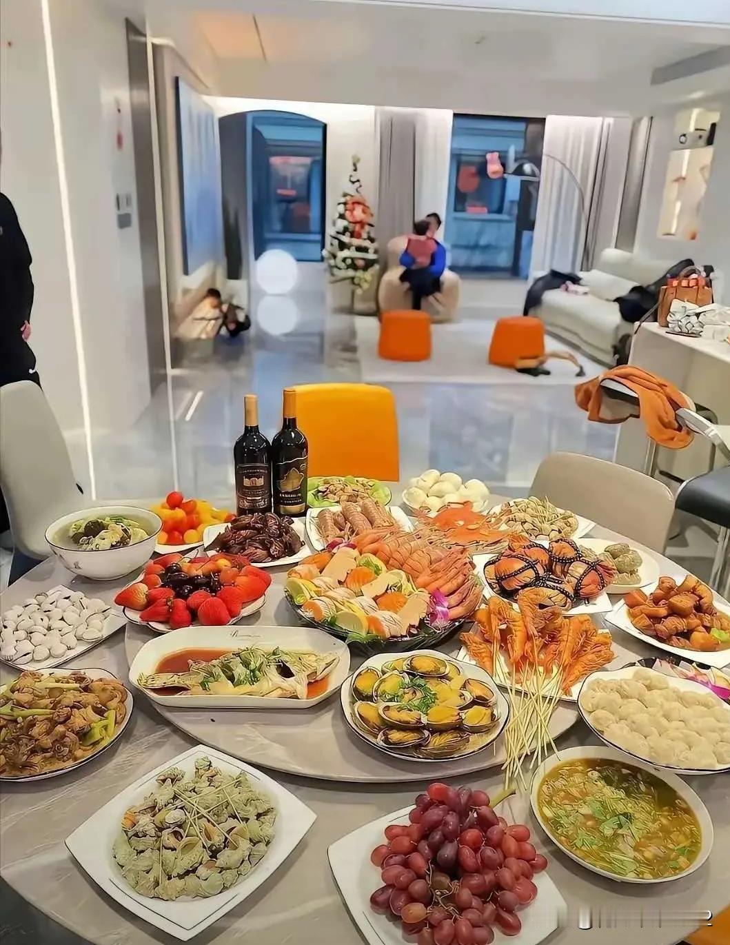 有网友说这是江浙沪的年夜饭? 有饺子的就不是江浙沪,一看就是东北人的饮食习惯,满桌子海鲜,还把虾搞成串串,螃蟹带绳蒸,这种不可能是江浙沪。[呲牙]