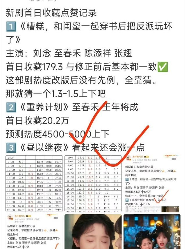 新剧首日表现1️⃣《糟糕,和闺蜜一起穿书后把反派玩坏了》主演:刘念 至春禾 陈添祥 张翅首日热度:🔥12428(这个属实没想到,收藏比《妯娌3》多了30万,竟然没有《妯娌3》高,不过成绩也不错了,恭喜四位演员实绩到手)2️⃣《重养计划》至春禾 王年将成首日热度:🔥4521 与预测一致✅3️⃣《昼以继夜》次日热度10378,涨300+📈,与预测一致✅