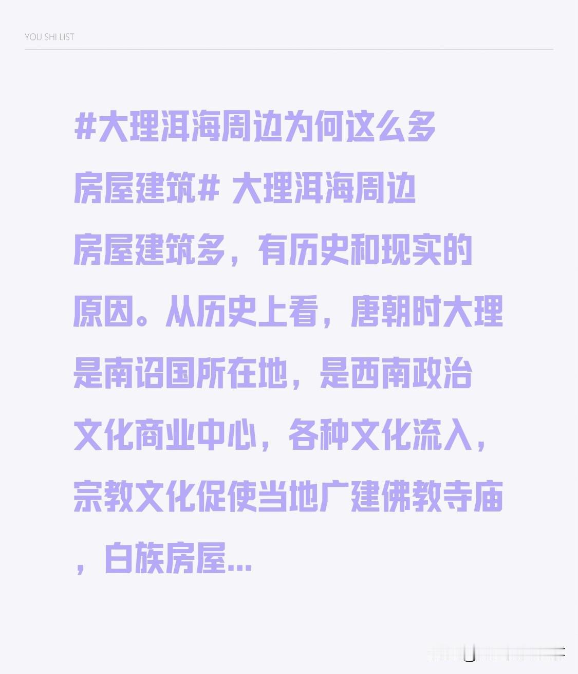 大理洱海周边房屋建筑多,有历史和现实的原因。从历史上看,唐朝时大理是南诏国所在地,是西南政治文化商业中心,各种文化流入,宗教文化促使当地广建佛教寺庙,白族房屋建筑风格也受影响。当地独特地理气候,因洱海形成大风天气,房屋有特别防风设计,且融合了中原汉族“榫卯”结构。 现实中,旅游业发展让大理成为“诗和远方”,外来人口剧增。过去沿湖大量房地产开发和城市建设兴起,虽现在严控开发、拆除违建,但之前已建了不少房屋。 大理 房地产 旅游
