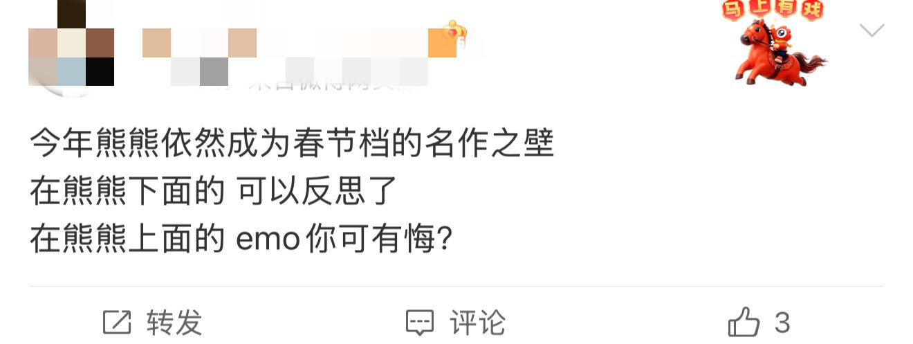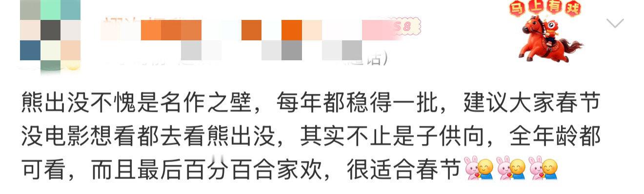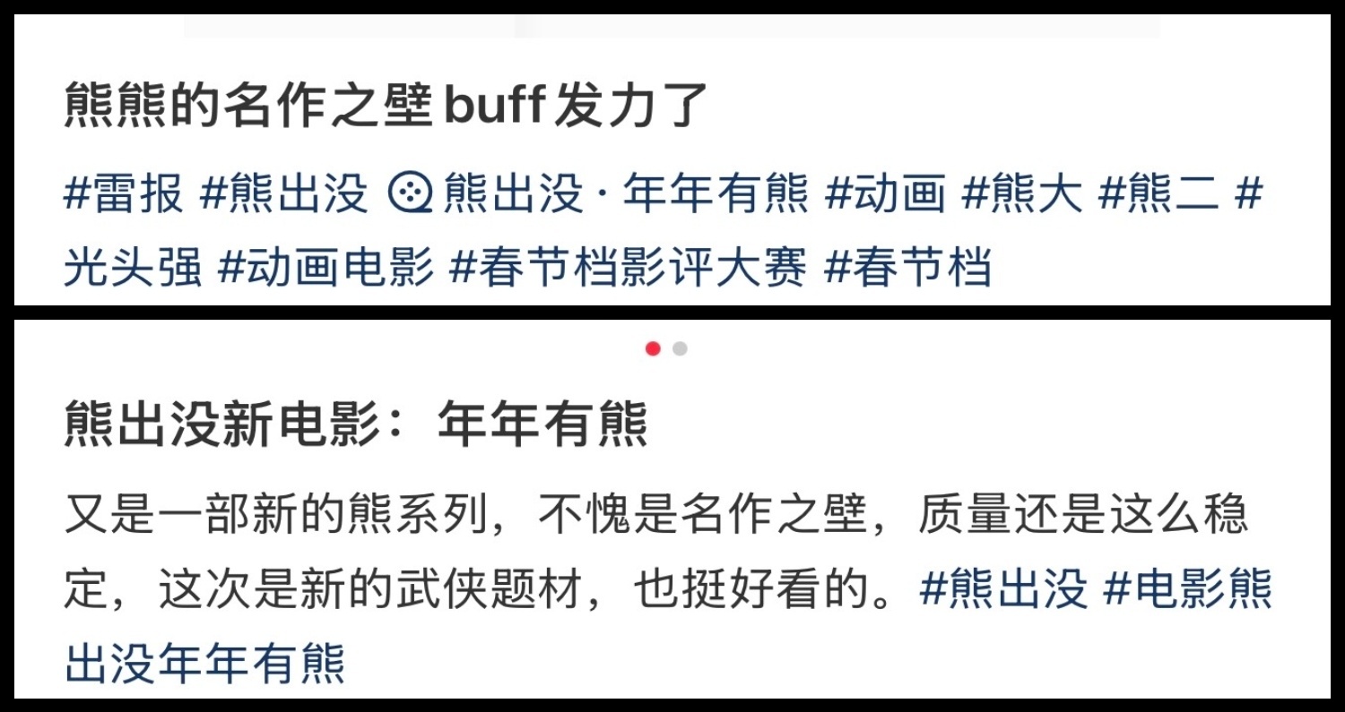 熊出没 春节档名作之壁春节档最长的河,国产动画最稳的船。熊出没用十二载光阴告诉我们:所谓情怀,不是喊出来的,是踏踏实实一年一年拍出来的。熊强三人组,无愧文化英雄。