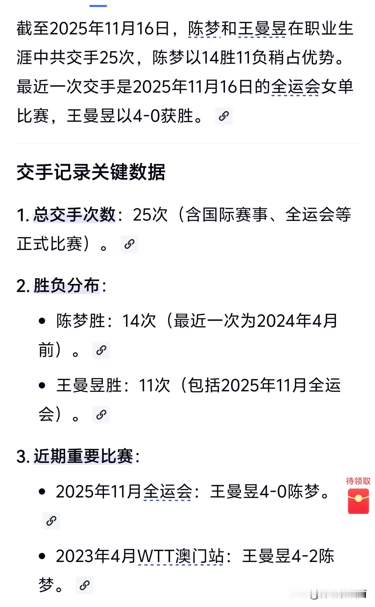 网络流行的说法是孙颖莎克王曼昱、王曼昱克陈梦、陈梦克孙颖莎,其实她们三个都是顶尖选手,在两个奥运周期构成了国乒女队的“金三角”,在国际比赛中所向披靡。 陈梦淡出之后,女队虽然看起来固若金汤,但与男队一样也存在缺一角的风险。她们三个相互之间互有胜负,陈梦与孙颖莎交手记录,2021年前陈梦成绩略占上风,2021年后陈梦状态下滑,胜率不如孙颖莎。陈梦与王曼昱也基本呈现这一趋势,总的交手记录25次,陈梦14胜11负,21年后陈梦状态下滑,王曼昱碾压陈梦。 莎梦昱球风循环相克的说法有一定道理,证明她们三个水平实力伯仲之间,谁输谁赢看状态看发挥,不存在绝对实力上的差距。从她们比赛对战的紧张程度看,孙颖莎与陈梦往往前四局缠斗厉害,打到第七局的很少,几乎没有擦边球方面的争议; 孙颖莎与王曼昱对战,孙颖莎整体上略占上风,第六局是关键局,打的也最紧张,几乎每次都打的难解难分,擦边球方面的争议也比较多。国乒考察队员着重看大赛和外战,她们三个都碾压同期队员,是女队国际比赛战绩的保障,都是国乒的功勋球员,国家给予高度肯定和荣誉,球迷和观众不应站在饭圈立场拉一踩一。 王曼昱 陈梦