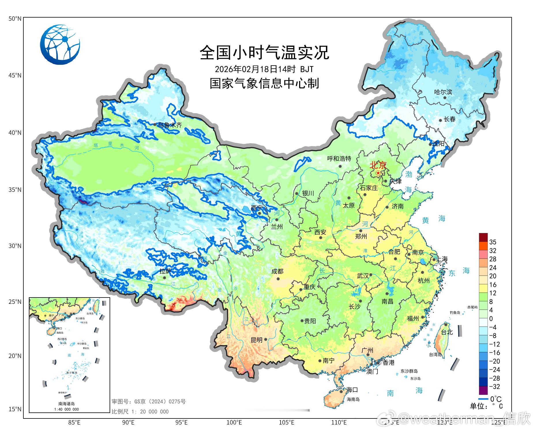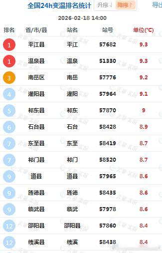 今天西北到华中华东华南气温回升,湖南、新疆、安徽、广西部分站点升温超8℃,比如湖南平江升9.3℃、新疆温泉升9.3℃、广西灌阳升9.1℃、安徽石台升8.9℃,为各自省区14时升温最强站点。今天升温后,依然存在气温南北倒挂,湖南湖北低于河南。