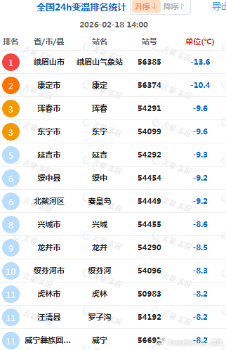 【气温波动】今天东北一带因为冷空气影响,四川部分地区以及贵州西部,因为云量增多,气温出现下降。四川峨眉山降13.6℃、吉林珲春降9.6℃、黑龙江东宁降9.6℃、辽宁绥中降9.2℃、河北秦皇岛降9.2℃,为各自省份14时降温最强站点。