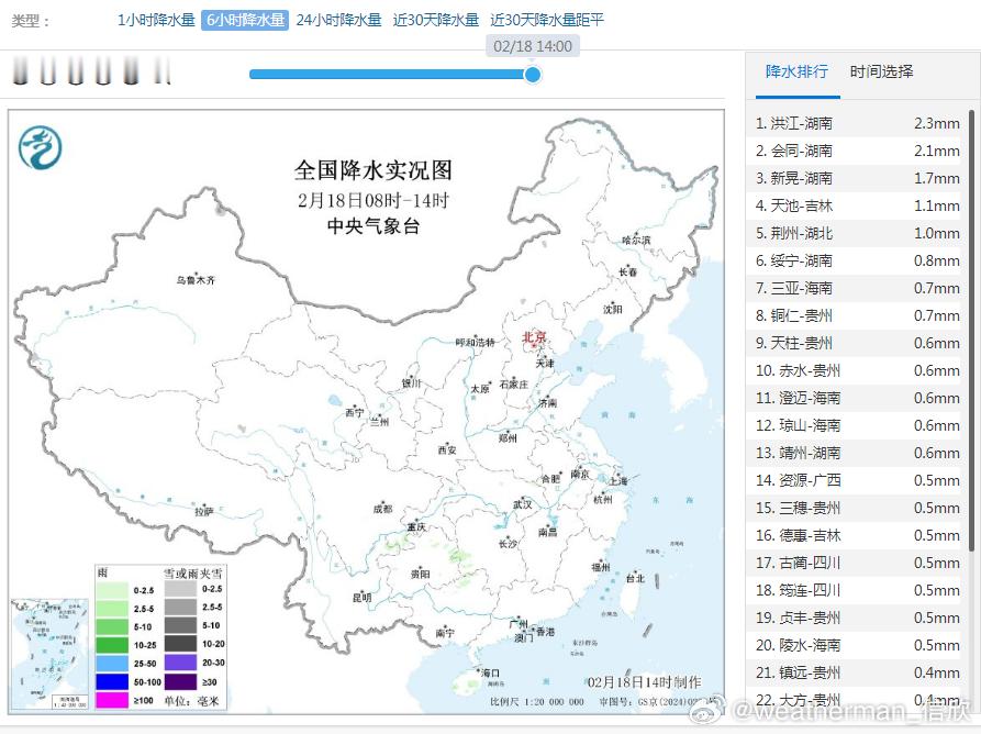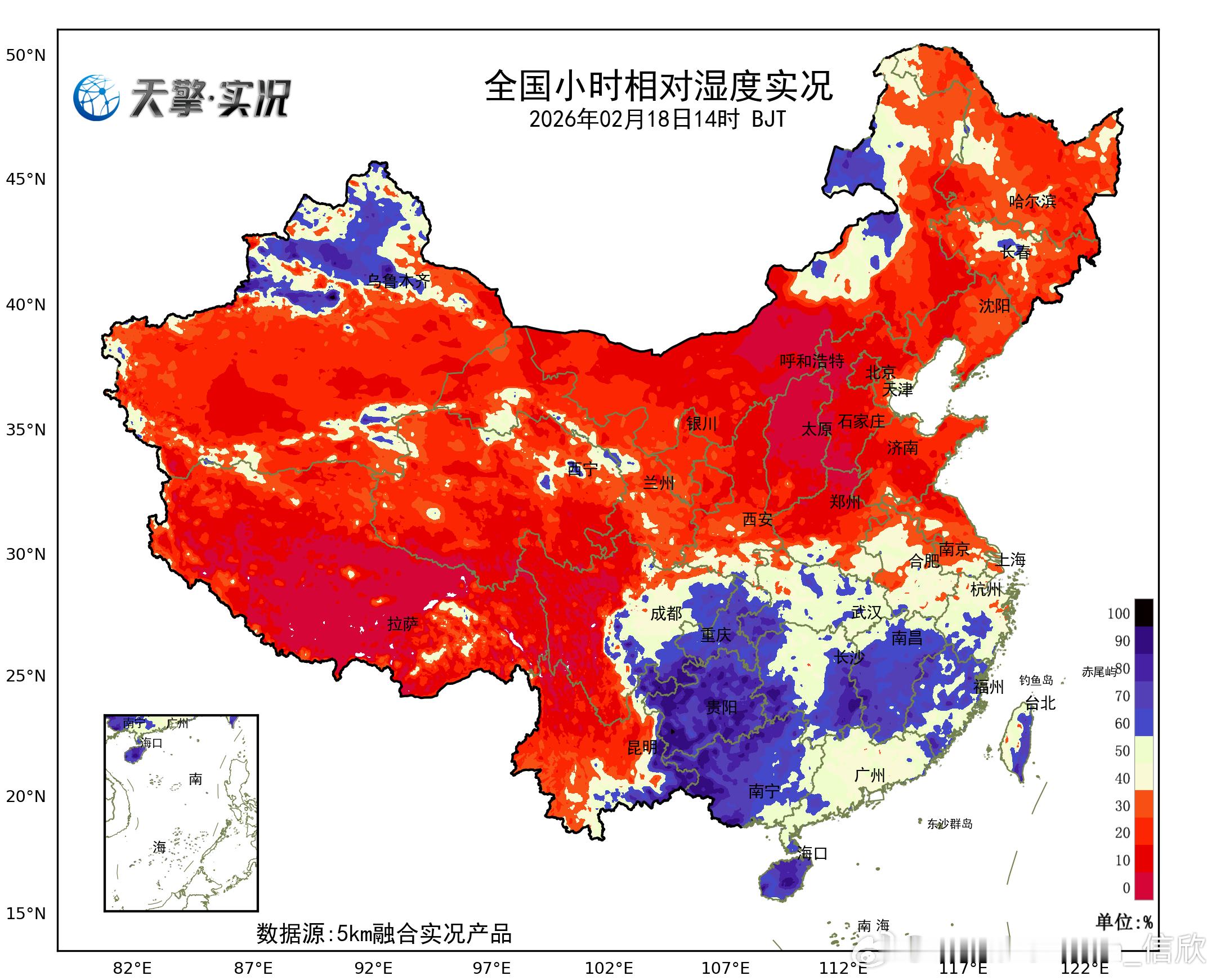 【降水和干燥】今天白天我国降水稀少,6小时1毫米降水量就能排到前五。13-14时降水榜,又凑不齐10个站点。今天青藏高原到华北黄淮多地,空气非常干燥,部分站点甚至不足10%,比如山西古交4%、内蒙古希拉穆仁6%、河南安阳6%、河北武安6%、北京延庆7%。今天下午到明天中午,北方干燥继续,南方降雨增多。