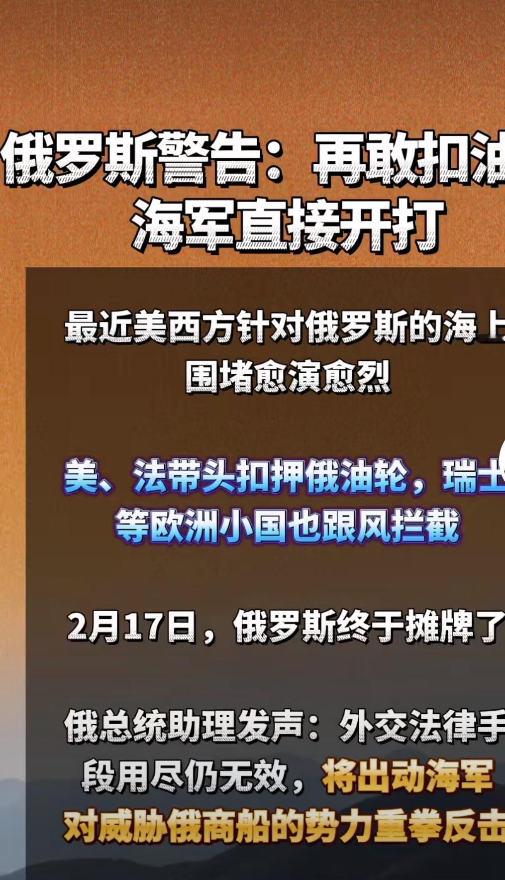 这话说得真够硬,一点面子都不给西方留! 2月17日,俄总统助理帕特鲁舍夫直接把话挑明了:“想和平解决海上封锁没戏的话,俄海军舰队就直接摧毁封锁。” 这态度,简直就是指着鼻子骂娘。 其实咱们都知道,大毛现在的海军家底真不富裕。苏联留下的老本吃得差不多了,新造的也就是些几千吨的小护卫舰,在黑海还沉了好几艘。 但这帮西方国家为什么听了还是心里发毛?因为人家是真敢拼命。 表面看是破船对坚船利炮,实际上是拿命博弈。公海拦截本来就是海盗行径,也就是欺负软柿子。 碰到这种真敢掀桌子的,哪怕手里只剩几艘核潜艇,欧美那帮绅士照样得哆嗦。 这年头,横的怕愣的,愣的怕不要命的。 帕特鲁舍夫这话太硬气,直接警告敢封锁就摧毁!面对西方海盗式拦截,只有敢于亮剑才能守住底线,这才是真正的底气吧?俄外发言人