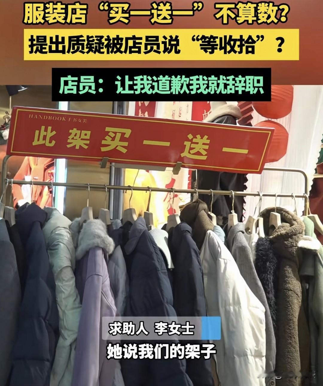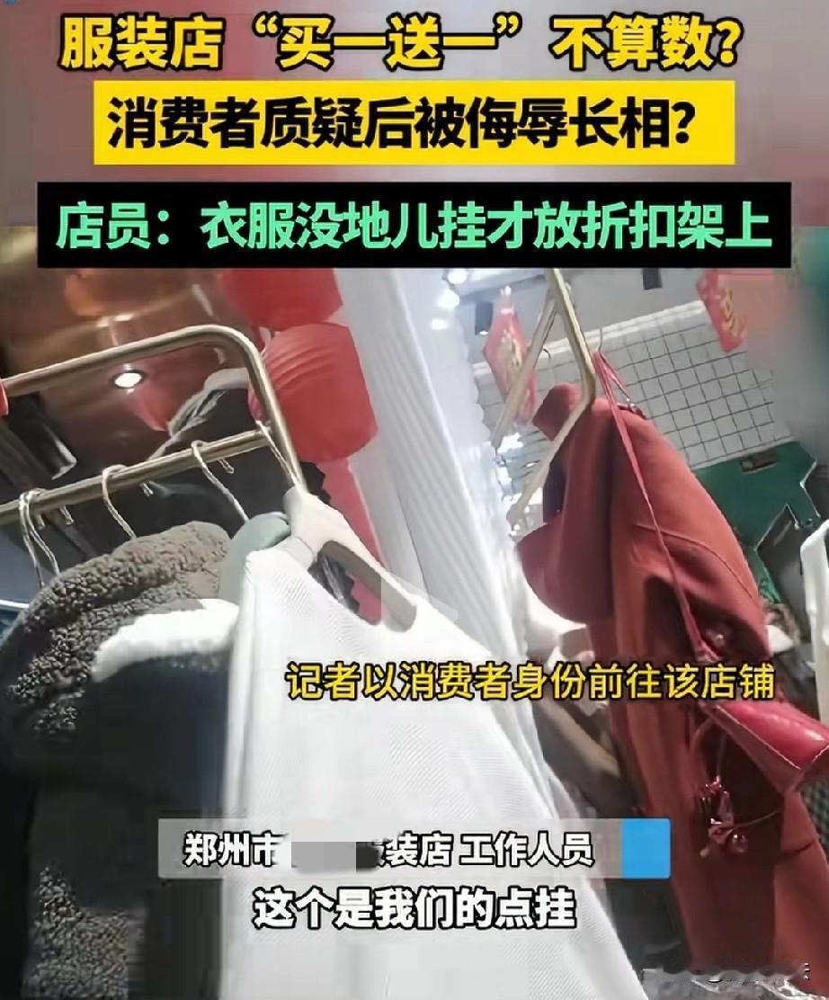 “气哭了!”河南郑州,女子在服装店见衣架上写着此架买一送一,她选了一件小衫后,想再挑一件,店员说:没有这活动。女子疑问:不是打折的吗?谁料,店员夺过衣服说:这是正价衣服没地方挂,才挂折扣架上。女子和其理论,又围上来3个店员,嘲笑着说她:你看你长的跟个大钢炮儿似的,没钱别买了。女子气到报警,没想到,店员拒不道歉,还扬言大不了不干了。女子又找到服装店负责人要说法,对方态度出人意料。 年前的时候,李女士发了工资,想着自己这一年挺辛苦的,就去了一家服装店准备买件衣服犒劳一下自己,不曾想,被店员给骂了,她一说起这事就委屈的掉眼泪…… 当时,李女士满心欢喜的拿着钱到了一家服装店,她看到店里衣架上放着“买一送一”的牌子,就看了一眼,一下相中了一件米白色的小衫。 她选好衣服后,想着既然是买一送一,那在挑一件围巾、外套什么的,出于礼貌她问了一句,这不是买一送一嘛,我是不是可以再挑一件? 不曾想,店员冷冰冰的说:没有这个活动,这件衣服是点挂,正价,没地方挂,就挂这上面了。 李女士很不解,就发出疑问:你这架上不是写的买一送一吗? 可万万没想到,店长直接过来,瞬间从李女士手里夺过那件她挑好的衣服,没好气地说:“你爱买不买,我们的衣服我们想咋挂就咋挂。” 李女士被这突如其来的举动吓了一跳,整个人都懵了,问她:你还让我买不让? 这时,三个女店员围了上来,站在边上语气带着嘲笑说了一句:“你看你长的跟个钢炮似的,没钱别买了。” 李女士当时非常委屈,周围一些人都在看着她,她恨不得找个地缝钻进去,眼泪含在眼圈,不知所措。 李女士和他们争论几句,便报了警,谁料,店员扔下一句话:你等着吧,收拾你的人一会就来了。 后来在商场工作人员和民警的调解下,让店员道歉,可是,店员愤愤的说:“行,都是我的错,我不干了行了吧,我不可能道歉。” 事后,李女士一想起这事心里就憋屈,她找到记者,想去店里问问,为什么这么欺负人呢! 其实,李女士身材是有点胖,她自己也知道,但是,也不能被人说的这么难听啊。 李女士哽咽着说:都工作一年了,也可不容易,发点工资,我就想买件衣服,还被人骂的这么难听。说着说着,她忍不住哭了。 记者陪着李女士一起找到服装店的负责人,还有商场的工作人员也来了。 一见面,李女士委屈的说:我没有说难听的话,就是正常买东西,她就欺负我,不信你可以打开监控,我真的没有一句添油加醋,实事求是这样说。 随后,李女士一五一十的把在店里发生的事又学了一遍,她说当时店员并没有道歉,还说可难听的话。 商场的工作人员说,确实有这么回事。 服装店负责人听完李女士的话,赶紧安慰她,先给你道歉,不管当时是一个什么样的情况,既然李女士来了,咱也不用纠结啥情况了,肯定是店员不对。 李女士解释说,我是一个实事求是的人,来之前,我害怕你觉得我冤枉你们了。 负责人立马打断她的话说,不不不,从你的面像,你的谈吐,我能看出来你没有撒一句谎,咱大人不计小人过,我们店里都是小年轻,临近年关都想回家过年,给你带来了不好的体验,我给你道歉了,真是不好意思了。 李女士一听服装店负责人这么说,心里的气消了一大半,不过,她和负责人提出一个建议。 你看你店里衣架上摆着此架买一送一,你本身不搞活动的衣服,你放上去是不是引起误会的开端? 商场工作人员也给李女士解释说:店里确实衣服挂的稍微拥挤,但是,一定要区分开,不要给顾客造成误解。 随后,商场工作人员笑着对李女士说,这件事确实让她受了委屈,商场愿意为此次误会买单。 说着,工作人员拿出一袋衣服说,这几件衣服您一定要收下,你试试看哪个号合适,不合适给你换。 李女士突然感觉受宠若惊,急忙拒绝,说什么也不要,但是,工作人员和服装店负责人热情又真诚的让她收下。 李女士推辞道,不行,我出钱买下来吧。 随后,李女士幽默的调侃自己,我这下调节好心情了,我想好了,我回家跑步减肥吧。 负责人一听就笑了,急忙拉着李女士的胳膊说,别别别,你形象挺好的,真的。 最终,李女士很开心的收下衣服,还表示以后还会再来商场买衣服的。 做生意讲究的是和气生财,挂着“买一送一”的牌子却不认账,这叫诱导消费,本身理亏在先。 从法律角度看,店员的行为已经触碰了底线。《治安管理处罚法》第42条明确规定,公然侮辱他人或者捏造事实诽谤他人的,处五日以下拘留或者五百元以下罚款。 店员骂顾客是“大钢炮”,这种带有强烈人身攻击色彩的言语,不仅是素质低,更是违法行为。 人家顾客正常问一句,店员不耐烦也就罢了,竟然还搞起人身攻击,嘲笑人家身材,甚至威胁“有人来收拾你”,这种“看人下菜碟”的傲慢,最伤人心。 好在商场和负责人的处理方式还算通透,没护短,认错态度也诚恳。道了歉,赠送了衣服,其实给的是个台阶,也是一份尊重。