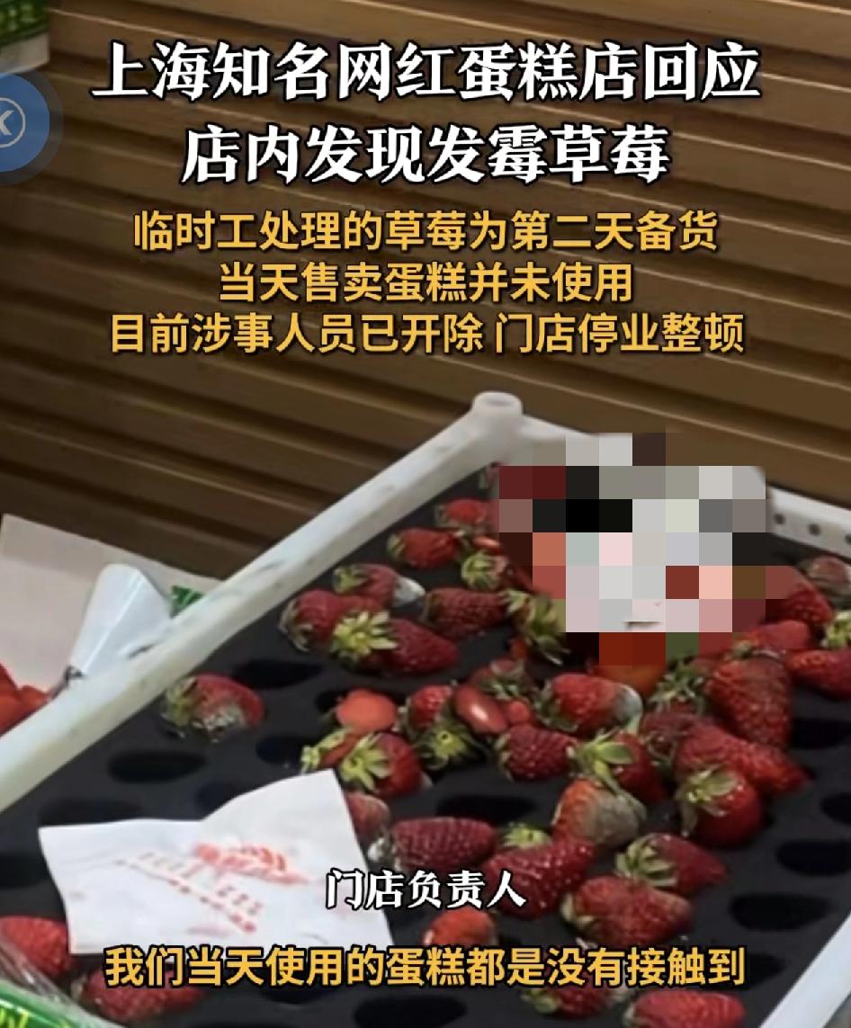 上海一家知名的草莓蛋糕店,被网友发现店员使用了发霉的草莓店面负责人表示,使用该发霉的草莓,是一位临时工,自己认为这一批草莓可以第2天再使用,但是涉事的蛋糕并没有接触到任何的消费者,当自己发现到员工的这种行为是已经立即制止了他,并且与该员工解除了劳动合同,目前店铺已经处已停业状态,像草莓这种水果,当天必须清理完毕,隔夜变味发霉,人吃了都会对身体有影响。