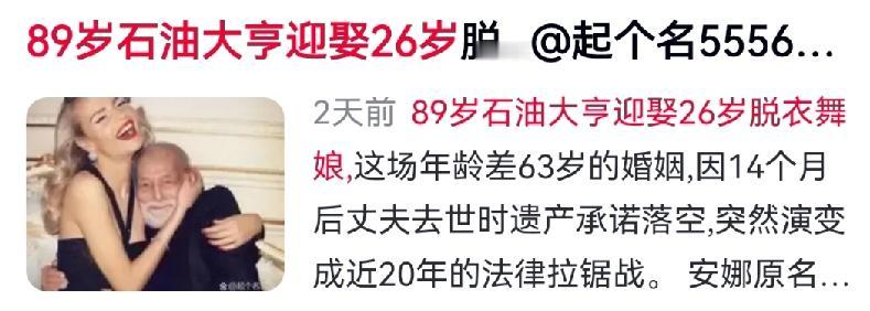 怎么看美国石油大亨霍华德,89岁坐拥16亿资产,娶了26岁的脱衣舞女安娜? 一场16亿遗产换命的豪赌!89岁石油大亨娶26岁脱衣舞娘,新婚10天就改遗嘱,结局太惨烈 美国石油大亨霍华德,89岁坐拥16亿资产,却迎娶了26岁的脱衣舞女安娜。1400万美金砸下去,所有人都说她一步登天。 可这场婚姻,从一开始就是精算好的交易。 婚礼才过10天,霍华德就悄悄改了遗嘱——许诺的8亿继承权没了,只剩每年70万年金,全部家产留给儿子。婚后14个月,老人离世,安娜的豪门梦碎得彻底。 她不认命,打了10年遗产官司,最后败诉,一分没拿到。 资本的世界哪有温情?只有冰冷的算计。 输光官司的安娜活成了笑话,奢靡无度,被舆论唾弃。更惨的是,儿子因药物过量死在她怀里,最后一根救命稻草也没了。 5个月后,39岁的她吞药自尽。青春、名声、性命,全赔进去了。 最讽刺的是——她以为自己是猎人,到头来不过是围猎场里的猎物。 这场不对等的赌局,开局就写好了结局。想靠青春换阶层?在资本眼里,你从来都只是明码标价的玩物。 世上最赔本的买卖,就是拿命赌明天。 对此你怎么看? 美国富商 亿万富豪离婚 美国金融大亨