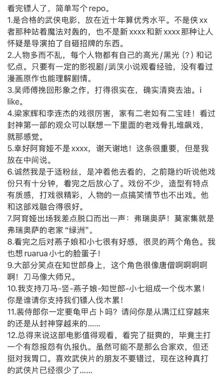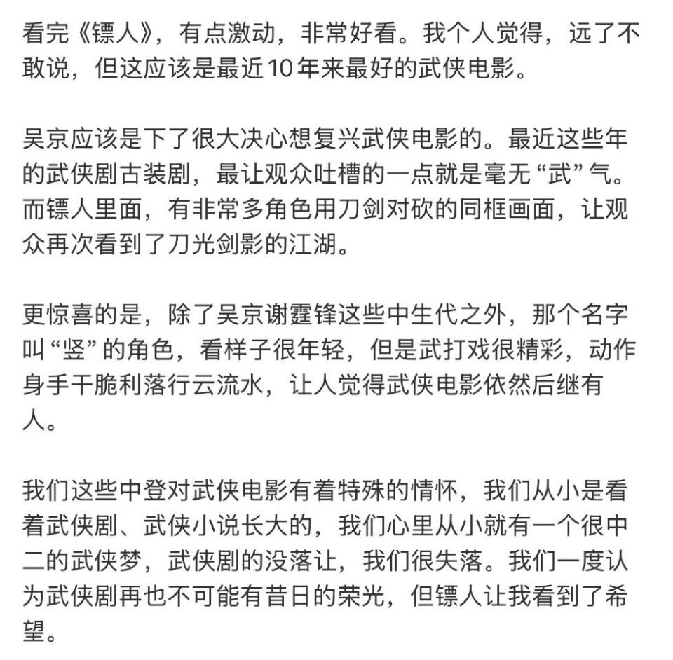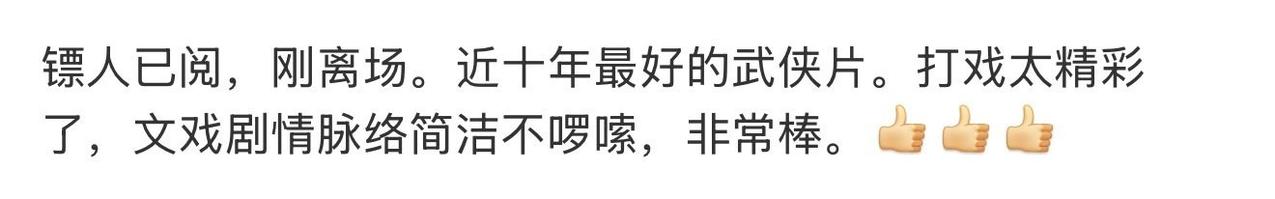 这段时间被《镖人》刷屏刷到我都好奇了,看完才明白,为什么这么多人愿意自发推荐。它很真诚,每一拳每一脚都带着力气,每一个角色都带着心事。 最让我震撼的是城墙决战那段。空间小、节奏紧,每一次交手都像在赌命,不是为了帅而打,是人物真的在绝境里撑着。打到后面,我已经不只是看动作,而是在替角色揪心。 看完最大的感受就是:这才是用心拍出来的东西,有热血也有沉重。春节档选它真的不亏。