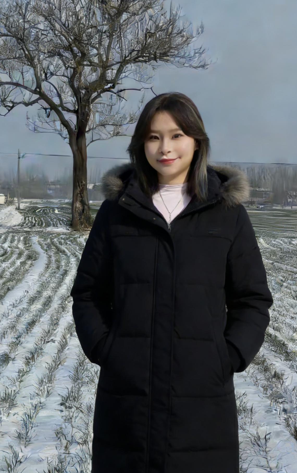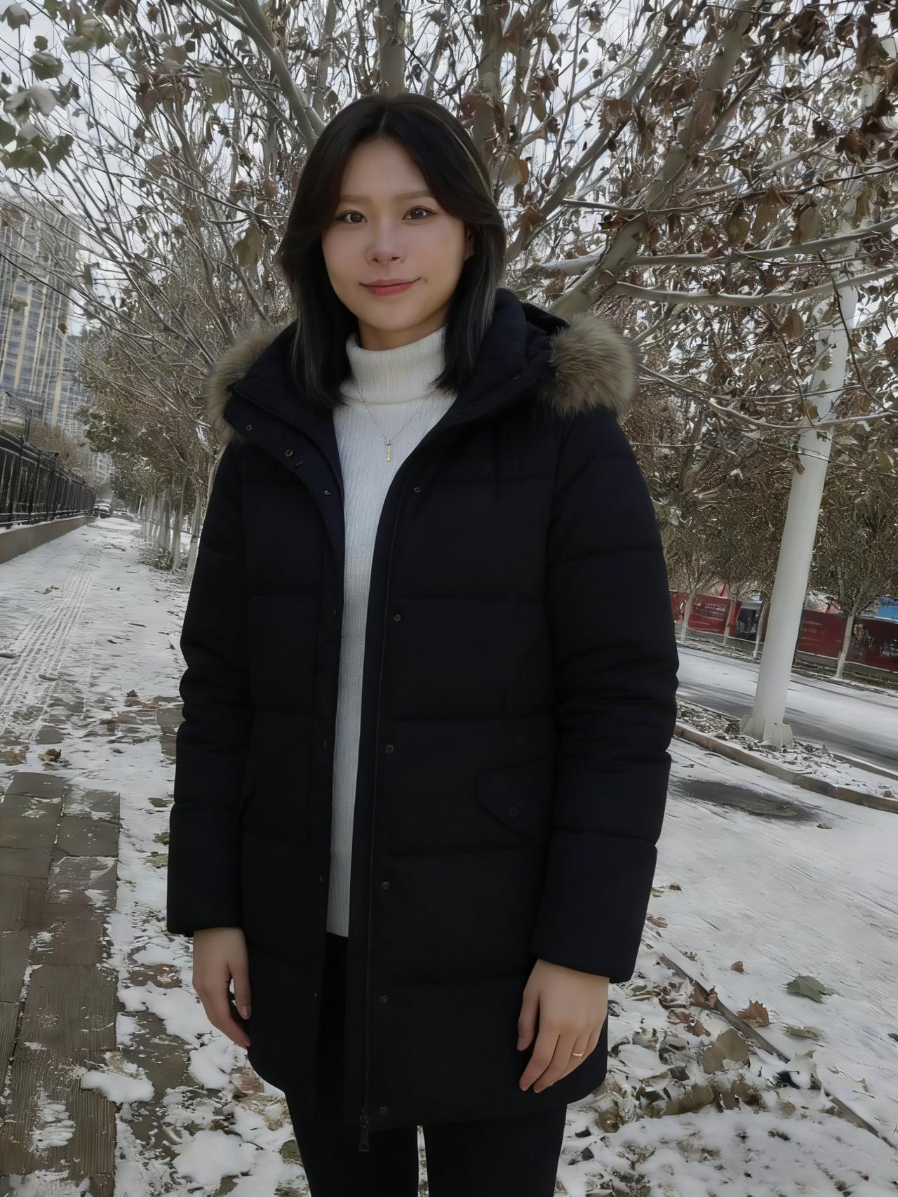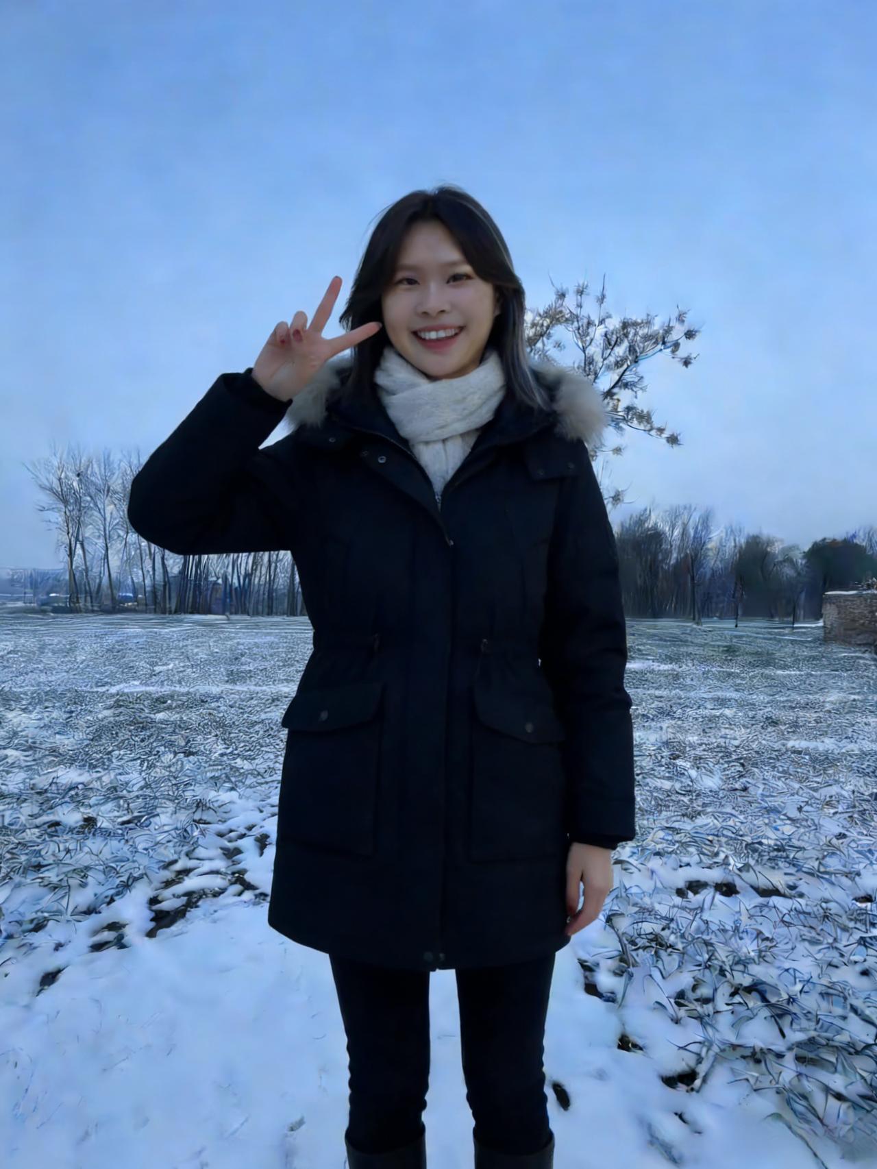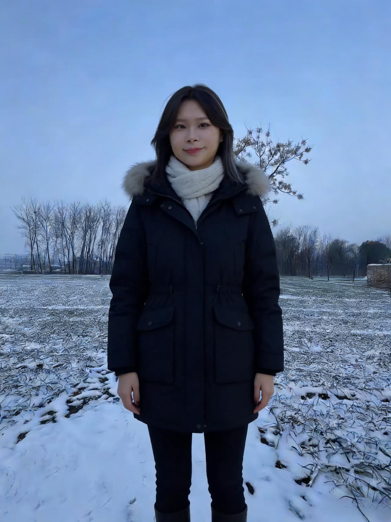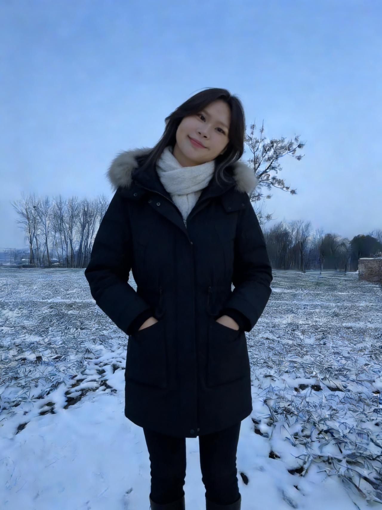 雪落进人间的缝隙时 你正站在老屋的槐树下 像一幅晕染未干的水墨,被冬日轻轻按住 ~ 青砖覆着薄霜,枯草从雪被里探出头 你的黑羽绒服,是画面里最沉静的墨色 毛领沾了细碎的雪粒,像星子落在肩头 围巾的米白,是雪地上漫开的一缕暖 ~ 风穿过光秃的枝桠,没掀起波澜 你垂着眸,指尖轻贴着衣摆 身后的麦田,雪纹纵横,像大地的掌纹 远处的烟囱,还没升起炊烟,天地静得只剩呼吸 ~ 我站在时光的对岸,按下快门 把这一刻的白与黑,定格成永恒 雪还在落,落在你的发梢,落在红砖墙上 落在我望向你的,温柔的目光里 ~ 这不是异乡的雪景,是故乡的雪 裹着童年的麦香,裹着老屋的温度 你站在那里,不说话,就十分美好 像雪地里长出的一株玉兰,清冽,又温暖 ~ 后来我走过许多飘雪的城市 见过霓虹下的雪,见过高楼间的雪 却总想起那个冬日,故乡的麦田边 你站在雪里,成为我心底,永不消融的倩影 ~ 风再吹,雪再落,岁月翻卷着向前 唯有这帧剪影,在记忆里,愈发清晰 它藏着雪的纯净,藏着故乡的温柔 更藏着,我见过的,最动人的模样