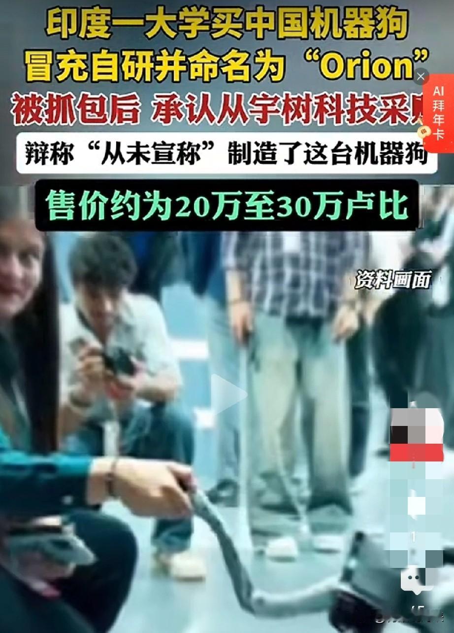 印度高校“自研”机器狗翻车了!网友一眼识破:这不就是中国货吗 最近印度搞了个“大新闻”——加尔戈蒂亚斯大学在展会上高调宣布,他们团队“自主研发”了一款叫“Orion”的机器狗,号称是“印度制造”的科技突破。 一名女性对着镜头侃侃而谈,表情自信,语气骄傲。结果网友放大一看:这不是中国宇树科技的Unitree Go2吗? 这台机器狗在国内都不算新鲜,海外市场明码标价,印度20万到30万卢比(约1.5万到2.3万人民币)就能买到。换个名字、撕个标签,就成“自主研发”了? 更绝的是被揭穿后的操作。校方先是嘴硬:“我们从来没说这是自己造的。”然后改口承认是从中国采购的,但强调是“学生学习工具”“探索自主研发的里程碑”。 社交平台X直接打脸,在声明下标注:校方说法“具有误导性”,他们确实明确声称过这是自研成果。典型的撒谎被抓,还死不承认。