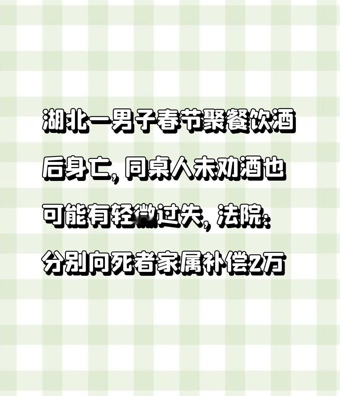 湖北一男子春节聚餐饮酒后身亡,同桌人未劝酒也可能有轻微过失,法院:分别向死者家属补偿2万 这一判决结果引发了社会的广泛关注与讨论。 在传统观念里,很多人认为只要同桌没有劝酒,在喝酒这件事上就无需承担责任。然而此次案件中,虽然同桌人并未进行劝酒行为,但法院判定其存在轻微过失并需作出补偿,这背后有着独特的考量。 从法律角度来看,同桌人在男子饮酒过程中,或许未能尽到合理的照顾、提醒义务。比如,当男子已出现明显醉酒状态,同桌人没有及时阻止其继续饮酒,或者在散席后没有对醉酒的他进行妥善安置和送医等。法官表示,在共同饮酒的特定场景下,同桌人之间形成了一种特殊的注意义务关系,即使不劝酒,也应当关注饮酒者的状态,保障其人身安全。 对于死者家属而言,这2万的补偿或许无法完全弥补失去亲人的痛苦,但在一定程度上给予了一些慰藉。而对于同桌人来说,这一判决无疑是一个深刻的教训。他们原本以为只要不劝酒就万事大吉,却没想到自己的一些疏忽也可能带来法律上的责任。 此案件也给社会敲响了警钟,提醒人们在聚餐饮酒时,不仅要做到文明饮酒、不强行劝酒,更要对一同饮酒的人负责。在享受欢聚时刻的同时,多一份细心和关怀,避免类似的悲剧再次发生。毕竟,每一个生命都值得被珍视,每一次聚餐都应是快乐且安全的回忆。