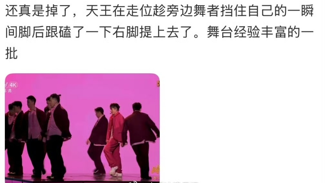 原来春晚上,王一博和郭富城跳的那个舞,背后故事这么精彩。天王郭富城跳舞的时候,不小心鞋子被踩掉了。要知道当时舞蹈动作特别大,节奏也特别激烈,鞋子掉了应该是特别严重的失误了。结果没想到郭富城稳如泰山,趁着镜头没拍自己,悄咪咪地把鞋子用脚提了上去。光看春晚的直播,相信很多人都不知道郭富城鞋跟有问题。这说明什么,说明人家郭富城还是有真本事的。换成其他演员,估计早就慌了吧。