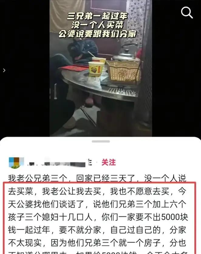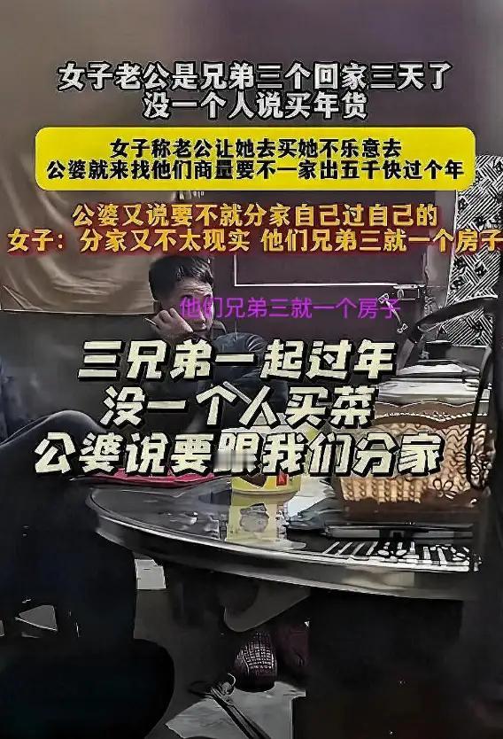 三兄弟一起过年不买菜后续: 父母要求分家 当事人发声 原因令人愤怒。 这则“三兄弟一起过年不买菜”的视频,揭示了当前多子女家庭在过年团聚时经常遇到的现实难题:虽然大家回家团聚,但在经济分担和家庭责任上却出现了明显的推诿和冷漠,导致原本应该温馨热闹的春节气氛变得尴尬甚至冷淡。 事件回顾 湖北一位姓张的儿媳分享了自家过年的尴尬局面:三兄弟一家三口带着各自的家庭回老家过年,十几口人齐聚一堂,本应其乐融融,然而却没有人主动承担买菜和办年夜饭的费用,大家都在等别人先出钱,最终老人忍无可忍,提出要么每家出5000元,要么分家过年。三兄弟听后沉默不语,场面十分僵硬。 社会关注点 视频一经发布,立即引发网友热议。大多数人对三兄弟的行为表示不满,认为他们缺乏担当和责任感,辜负了老人含辛茹苦养育的期望。许多网友也纷纷分享了自己家庭中类似的情况,反映出多子女家庭中“谁都不愿多出一点”的普遍矛盾。 深层问题分析 经济压力与心理博弈:尽管三兄弟均在外打工,经济条件并非完全无力承担年货费用,但“先付钱”和“吃现成”的心理让他们陷入了推诿的怪圈。谁都不想吃亏,谁都期待别人先主动承担。 责任感缺失:作为成年子女,尤其是家庭收入较好的成员,应当主动承担起照顾父母和家庭的责任,而不是在关键时刻选择沉默或回避。 多子女家庭的协调难题:相比独生子女家庭,多子女家庭在资源分配、责任承担上更容易出现分歧和矛盾。如何协调好彼此的关系,避免“三个和尚没水喝”的尴尬,是考验家庭管理智慧的重要方面。 儿媳的辛酸:作为媳妇,张女士不仅要照顾自家小家庭,还要面对婆家复杂的人际关系和经济压力,这种“嫁进去就得操心一大家子”的现象让不少网友感同身受。 性别角色的传统影响:网友提到如果是三个女儿,情况或许会不同,暗示传统观念中女性承担更多家庭责任,男性反而容易推卸义务,这也是社会性别角色分工的一种反映。 网友观点摘录 “三个兄弟都太会算计了,费用可以平摊,结果谁也没出钱。” “老大应该出面协调,父母年纪大了,不能让他们操心这些事。” “我邻居四兄弟,每年回来几十人热闹得很,费用都是大家平摊,家庭和睦才是关键。” 总结与启示 春节是团圆的时刻,更是家庭成员互相扶持、传递温情的时刻。经济上的分担不仅是钱的问题,更是责任和态度的体现。多子女家庭更需要讲究沟通与协调,避免“推诿责任”导致家庭关系破裂。作为子女,应主动承担起应有的义务,让老人感受到家的温暖,而不是用沉默和算计冷却亲情。 这个事件提醒我们:家庭和睦,靠的是每个人的担当和付出,不是单纯的物质投入,更不是“装作没看见”的冷漠。只有心往一处想,才能共度一个真正温暖的春节。