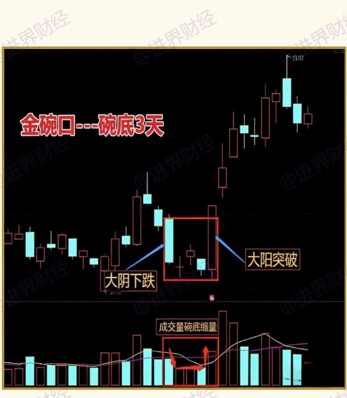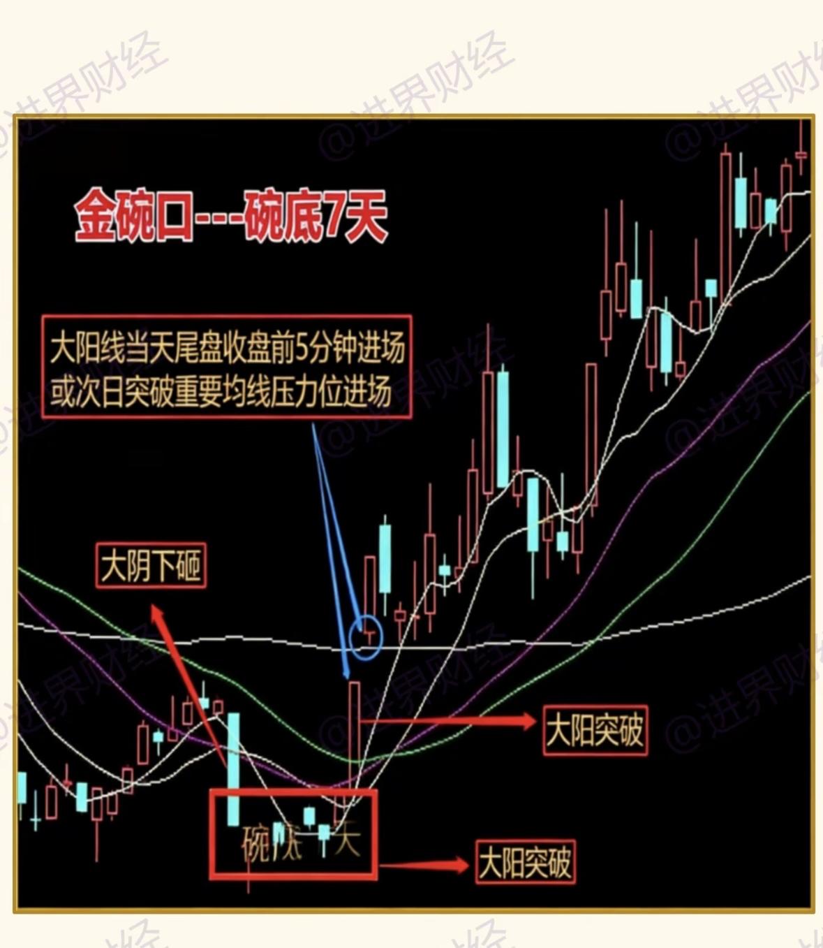 炒股时遇到“金碗口”形态可别错过。“金碗口”就是走势像碗口,K线表现为股价大阴线下跌后,用十字星、小阴阳线整理,幅度不超2个点,再以大阳线结束调整。 技术要点不少,大跌后缩量十字星报收,整理期十字星和小阴小阳为主,区间在2个点内。突破整理平台或重要均线可买入,止损在平台底部。结合热点成功率更高。 一般有两个进场点,一是大阳线尾盘进场,能避回落;二是突破重要均线获支撑后进场,更稳。遇到“金碗口”形态,等3到5天,至少能有10个点以上收益,果断抓住机会!