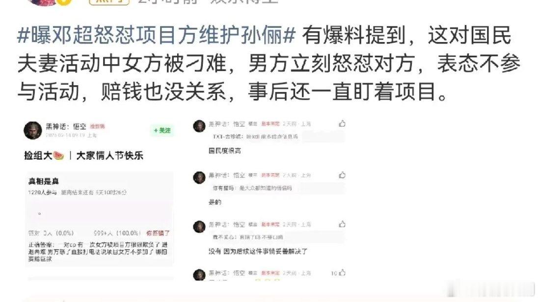 爆料里说,女方在活动中被对方狠狠拿捏,进退两难,男方当场炸了,直接打电话放狠话:“女方不参加了,哪怕赔巨款也无所谓!”事后还一直盯着项目,生怕女方再受欺负。网友顺着“国民度很高”“两口子”“gogogo”等关键词,瞬间锁定了邓超和孙俪。毕竟这对夫妻的恩爱是出了名的,邓超的“霸总式护妻”也不是第一次了。