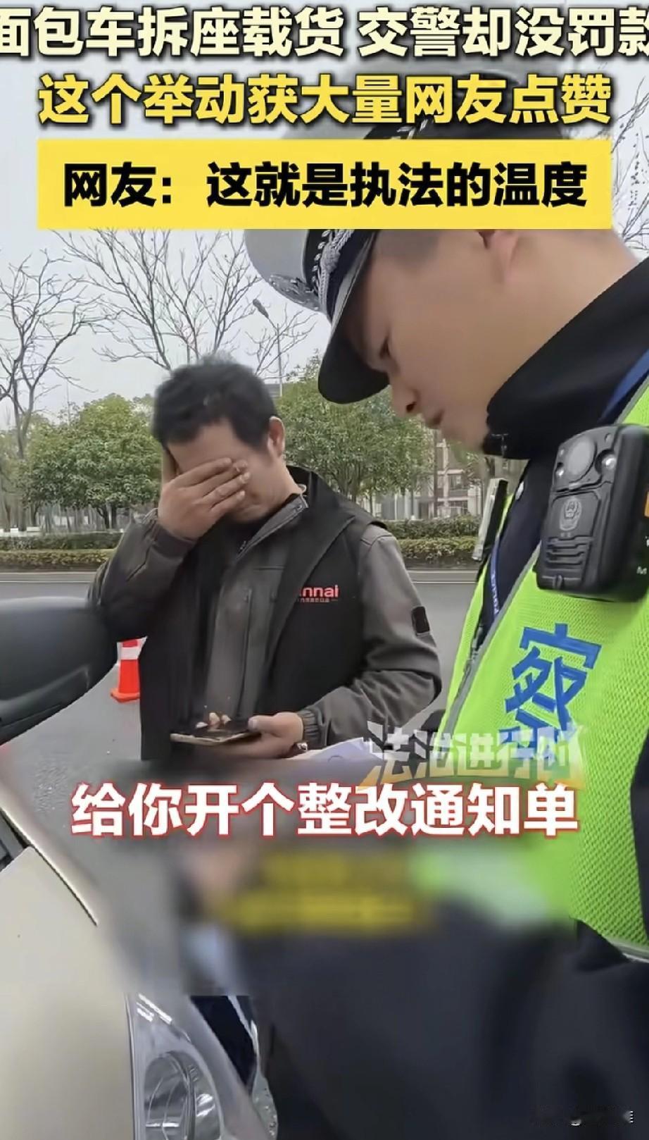 “破防了!”春节期间交警查车,遇到一辆为了多拉货拆掉座椅的面包车,车主下车后满脸堆笑,试探性的问交警能不能少罚点,交警没有搭话,准备开具罚单,随口问了一句:“过年怎么还在拉货?”司机回答:自己三个小孩,老父亲还患有癌症,自己又没有什么技术,由于过年期间拉货的少,多干点,就能多挣点。交警听到这,放下了手中的罚单,对司机说到:今天只给你开具整改通知书,罚单就免了回去之后把座椅装上,不能私自改装车辆。司机感激的连连点头!这位交警在得知司机还没有吃饭后,又把他带到岗亭给他泡了一碗面。网友说:这才是有温度的执法!
