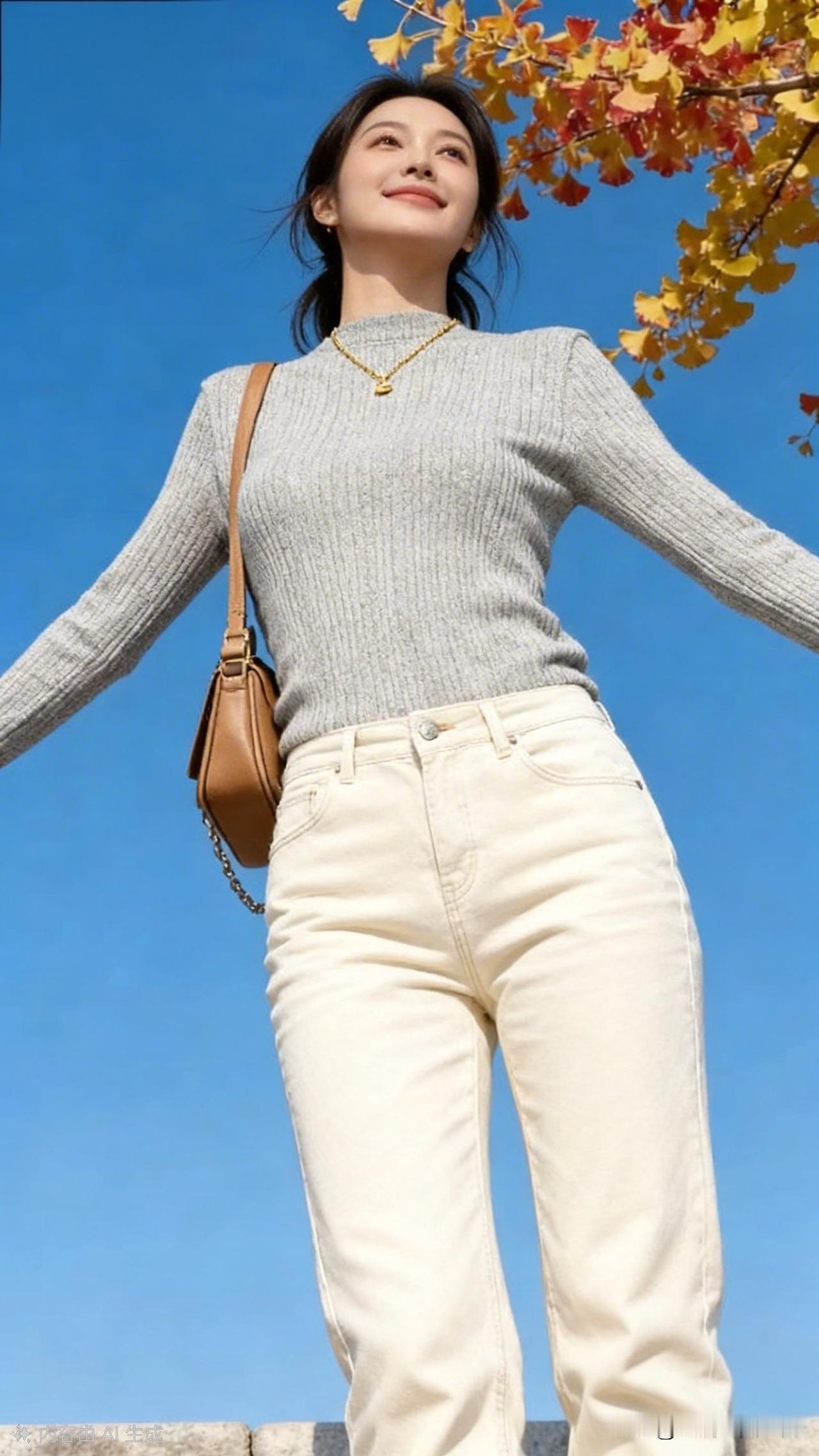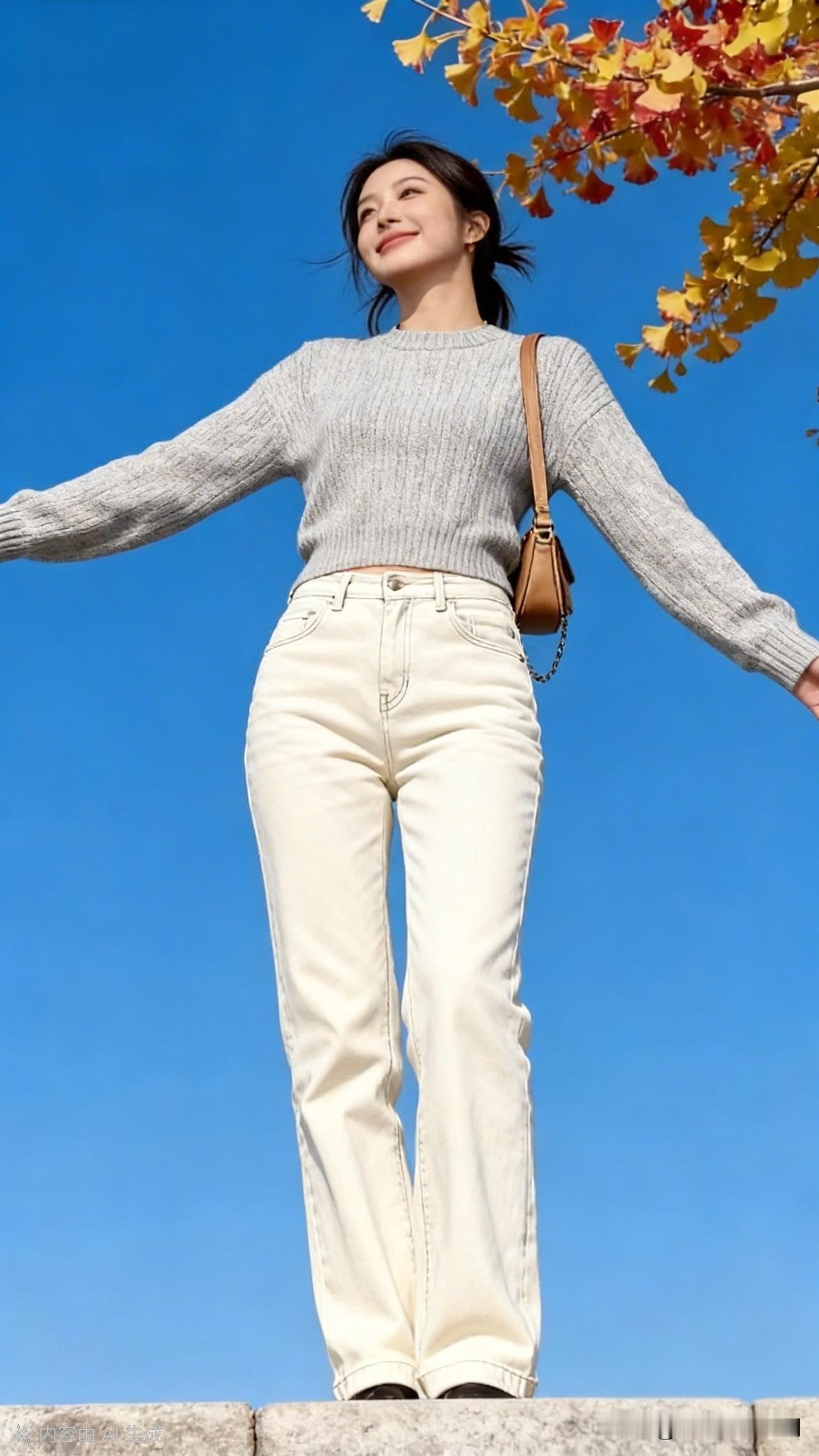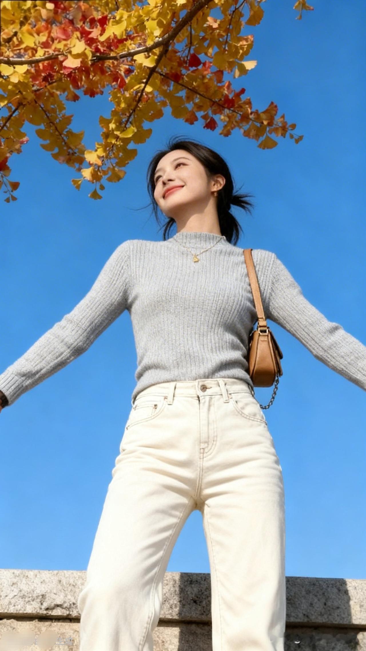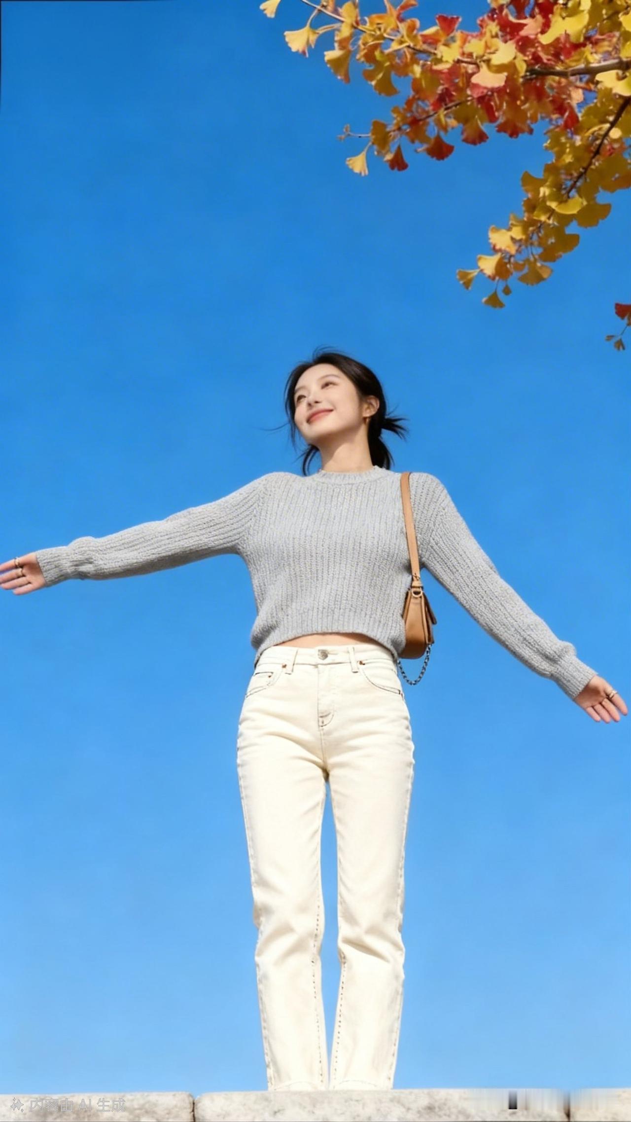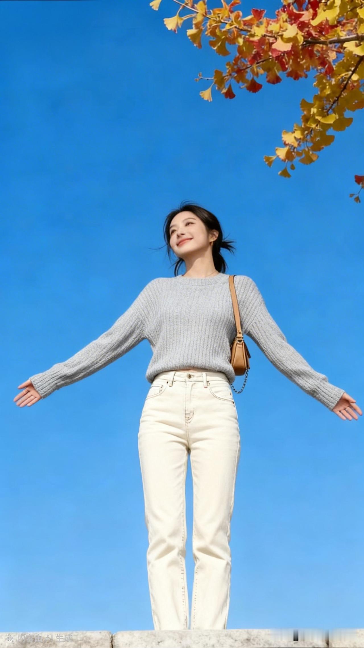 这画面美到犯规!蓝天白云之下,金黄的树叶如大自然精心绘制的华丽画卷,那位少女仿若从画中轻盈走出的仙子。她身材高挑,身姿曼妙,浅灰色的针织衫柔软又温暖,米白色的牛仔长裤简约干练。温柔粉嫩的妆容,更添了几分甜美。 这一身穿搭堪称秋季时装的完美典范。在公园里,她自然地舒展双臂,尽情放松,享受着大自然的恩赐。她好似千库网上秋季时装摄影作品中的女孩,惬意又迷人。这般画面,谁能不心动?