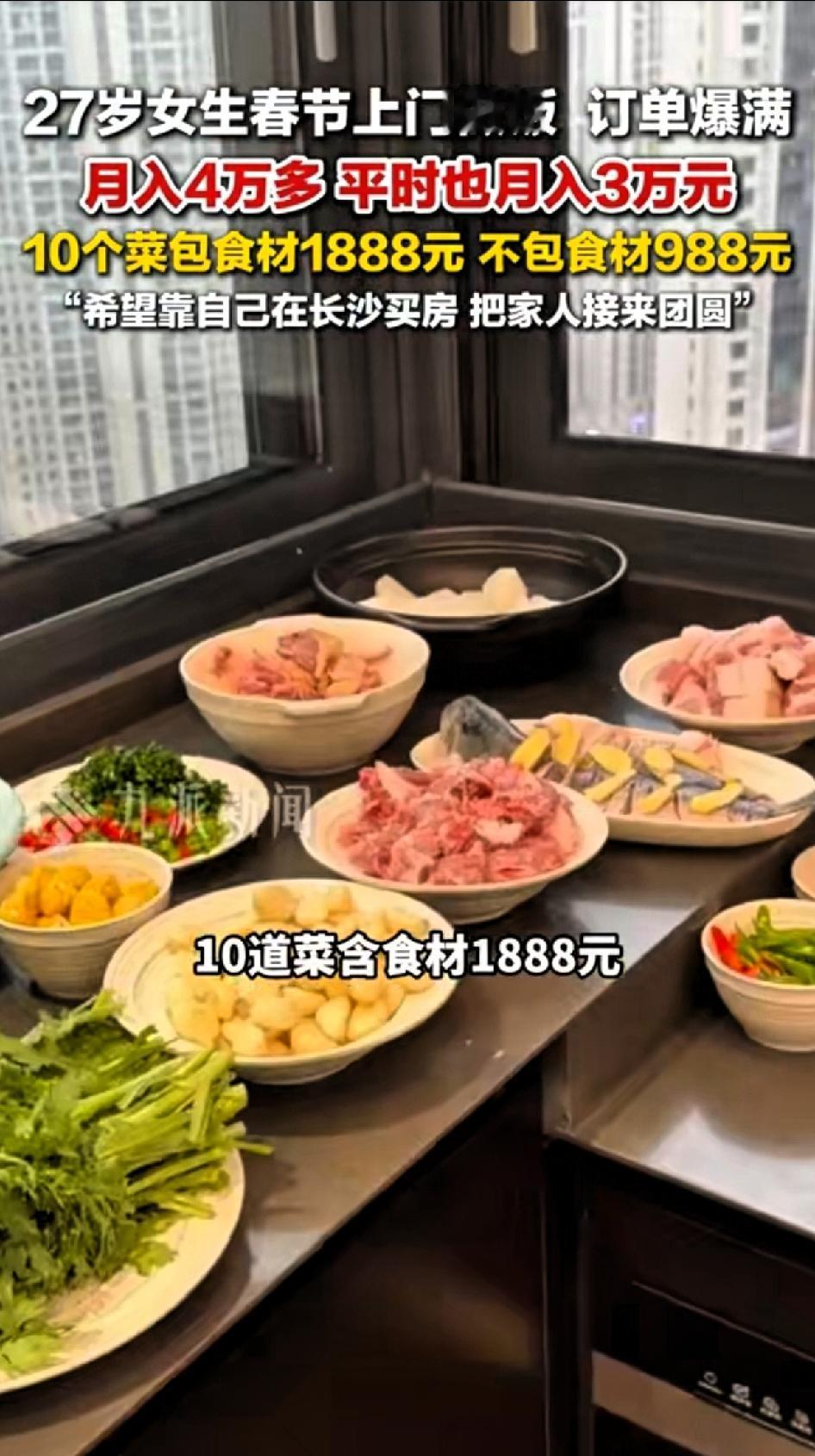 27岁女生春节上门做饭订单爆满,月入4万多,平时也月入3万多。 2026马年春节,“上门做饭”成了最火新职业。湖南长沙27岁女生曾恋,靠上门做年夜饭和家宴,春节单月收入近4.5万,平时月入也稳定在3万左右,档期提前一个月就订满。手艺肯定非常好,干活也麻利。 她收费清晰,10菜家宴套餐,包食材1888元/桌,不包988元/桌。除夕忙到只能用水果和泡菜充饥。 她是临时决定留长沙接单,“先斩后奏”让家人无奈。她觉得年轻能赚就多赚,还享受赚钱爆单的乐趣。这样才通透,能挣钱时候就要多挣钱,别人去忙了,你再来享受生活多好玩,不用赶到假期人挤人,去哪看都是人。 杭州的林悦也类似,一个月接单78单,收入超4.2万。上门做饭已成新型灵活职业,是年轻人就业新选择。
