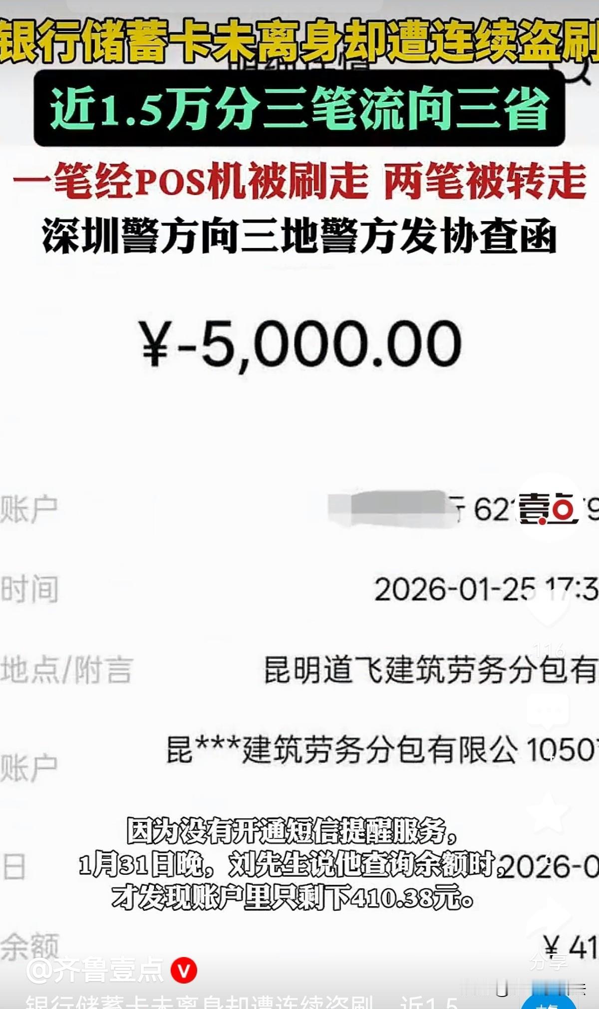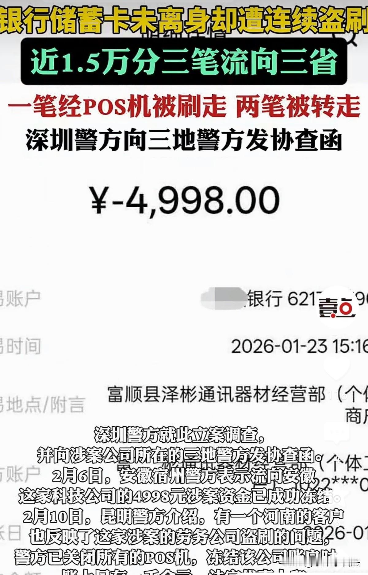 “胆战心惊!”深圳,男子有张建行工资卡,是5年前办的,一直闲置,但卡片未离身。朋友还钱打至此卡中,里面有15700元,他想着将数额凑50000元提现,好回老家给老人现金。一日晚,他突然发现卡里只剩410.38元钱了,他大惊失色,查看银行流水更懵了,连续3天卡被盗刷,自己未开通短信提醒服务,竟然不知道,他赶紧将剩余的钱从卡中全部取出。警方调查告知:3笔盗刷资金分别流向3个省!男子认为:银行卡一直在身边,未泄露密码、也非本人操作,却发生大额盗刷,银行理应承担资金安全保障责任。银行回应会配合警方调查。 刘先生五六年前在建行办的工资卡,平日里几乎处于闲置状态。 他只把这张卡绑定了微信支付,平时消费也很少用,银行卡一直放在他卡包里,从来没有外借、丢失过。 之前卡里余额不多,前段时间朋友归还欠款,账户里一下子有了15700多元。 刘先生心里盘算着,再从其他卡里转点钱进去,凑够50000元取成现金带回老家。 老家的老人不会用智能手机,出门办事、日常开销都只认现金,这笔钱就没动,是他专门为老人准备的,每一分都记得清清楚楚。 因为没有开通短信通知服务,刘先生全靠自己记着账户余额。 1月31日晚上,他拿出手机准备核算转账金额,打算凑50000元尽快取现。 可当他点开银行账户余额时,屏幕上的数字让他瞬间僵住!原本近15000多的余额,只剩下410.38元。 刘先生揉了揉眼睛,反复刷新页面,数字依旧没有变化,那一刻,他脑子里一片空白,心脏突突直跳,又惊又慌,完全不敢相信自己的眼睛。 冷静下来后,刘先生赶紧查询交易流水,一页页翻下去,越看越心凉。 这笔钱根本不是他花的,而是在1月23日-25日这三天里,被人分三笔悄悄转走了。 1月23日,第一笔4998元通过POS机被刷走;1月24日和25日,又分别被转走5000元,三笔加起来整整14998元,一分不多一分不少,刚好把卡里的钱几乎掏空。 更让他费解的是,三笔资金的收款方完全不同,分别是四川富顺县的一家通讯器材经营部、安徽宿州市的一家新能源科技公司,还有云南昆明的一家建筑劳务分包公司,后两笔交易还标注着“消费”字样。 自己人在深圳,卡在身上,没泄露过密码,也没进行任何操作,钱怎么会凭空刷到千里之外的三个省份? 刘先生越想越后怕,当晚就赶紧把账户里剩下的410多元全部转出,生怕仅剩的一点钱也被不法分子卷走。 那一晚,他辗转难眠,满脑子都是被盗刷的钱,既心疼又气愤,更多的是对银行卡安全的担忧。 2月1日一大早,刘先生就赶到建设银行网点,打印了完整的交易流水,拿着凭证直奔派出所报警。 先后有三名民警仔细盘问细节,还逐一检查了他手机里的各类软件、银行账户信息。 可即便反复核查,大家都没能弄明白,在卡片未离身、信息未泄露的情况下,盗刷究竟是如何发生的。 好在警方的调查进展十分迅速,立案之后,深圳警方立即向四川、安徽、云南三地警方发出协查函,全力追查涉案资金。 没过多久,好消息就陆续传来。2月6日,安徽宿州警方主动联系刘先生,告知流向当地新能源科技公司的4998元已经成功冻结,这笔钱有了追回的希望。 2月10日,云南昆明警方也反馈,当地涉案的建筑劳务分包公司POS机已全部关闭,警方冻结该公司账户时,账上仅有一千余元。 目前公司法定代表人和实际控制人还在追查中。唯独流向四川的那笔资金,暂时还没有有效的追回线索。 看着警方一步步推进调查,刘先生心里稍微踏实了一些。 但他始终想不明白,银行卡的安全保障本该由银行负责,自己没有任何过错,卡片全程在身边,密码也从未告诉过别人,却遭遇了这样的盗刷,银行理应承担起资金安全的保障责任。 《民法典》第577条:当事人一方不履行合同义务或者履行合同义务不符合约定的,应当承担继续履行、采取补救措施或者赔偿损失等违约责任。 建行未尽安全保障义务,构成违约与违法,刘先生无任何过错,银行应当全额赔偿被盗刷的14998元及相应利息。 他多次联系建设银行客服,对方表示已登记问题,正在加急核查处理,也会全力配合警方的调查工作。 截至目前,这起跨三省的盗刷案还在进一步侦办中。 有人说,自己去取大额现金,银行总是刨根问底,现在在银行被盗刷了,必须要银行给一个合理的解释。 对此您怎么看?