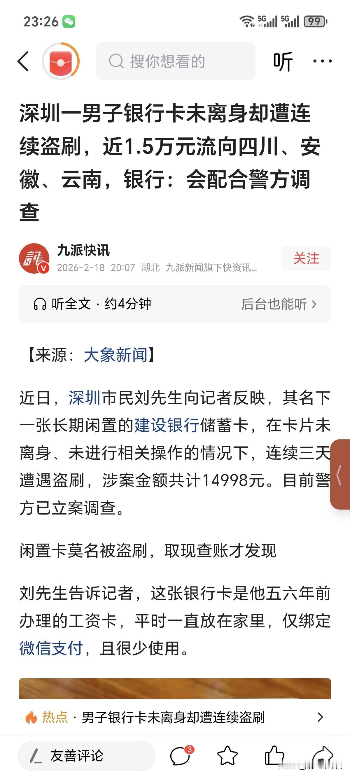 太吓人了!深圳,男子有一张某行工资卡,里面有1.5万存款,突然有一天,他发现卡里只剩410.38元。男子赶紧去查流水,卡没丢、密码没泄露、本人也没操作,钱却连续三天被盗刷,近1.5万分流到四川、安徽、云南三省。男子已报警,钱款至今未追回。他认为自己已尽到保管责任,对方'应当承担赔偿责任。 刘先生就遭遇了这样一件离奇又闹心的事,直到现在想起来,依旧后背发凉。 工资卡好好放在家里,从没外借、从没乱刷、密码也没告诉过任何人,里面的钱居然能悄无声息被人转走? 事情是这样的,五六年前,刘先生在某行办理了一张工资卡,平时用得并不多,只是绑定了微信,偶尔小额支付。 之前卡里钱不多,后来朋友还了一笔钱,加上之前剩下的,账户里一共攒到了15700多元。 他本来盘算得好好的,再从别的卡里转点钱,凑够5万元现金,带回老家给家里老人。 老一辈人不会用智能手机,也不信手机支付,只认实实在在的现金。 可就在1月31日晚上,刘先生打开账户,准备算算还差多少钱时,眼前的数字让他当场愣住了。 原本近1.5万元的余额,竟然只剩下410.38元。 一万多块钱,就这么凭空消失了。 更让他崩溃的是,因为这张卡不常用,他并没有开通短信提醒服务。 也就是说,钱被一笔笔转走的时候,他完全不知情,直到自己主动查账,才发现账户早已被掏空。 刘先生又惊又怕,当天就赶紧把剩下的几百块转了出来,第二天一早就跑到银行网点打印流水。 流水单一出来,他更是头皮发麻,钱不是一次性被转走的,而是在1月23日、24日、25日连续三天,分三笔被盗刷。 1月23日:通过POS机刷走4998元。24日:被转走5000元。25日:再被转走5000元 三笔钱,分别流向四川、安徽、云南三个省份的三家公司,每一笔都显示为“消费”。 可刘先生本人,那段时间根本就没去过这些地方,也从来没有进行过这些交易。 卡一直在家里,人在深圳,钱却跑到了千里之外的三个省份,这任谁听了都觉得不可思议。 刘先生当天派出所报了案。让他更不安的是,民警在做笔录时,前前后后仔细检查了他的手机、各类软件、银行账户。 甚至连可疑链接、陌生APP都排查了一遍。 先后有三名民警参与核实,愣是没弄明白,这笔钱到底是怎么在卡不离身、密码不泄的情况下被转走的。 立案之后,立即向三地警方发出协查函,案件总算有了一点点进展。 安徽涉案账户的4998元已成功冻结。 云南涉案公司的POS机已被关停,但账户里只冻结到一千多元,法人和实际控制人至今还没联系上; 四川那笔资金,目前仍没有有效追回线索。 一万多块钱,对普通人来说不是小数目。刘先生越想越委屈。 卡我放好了,密码我没泄露,交易不是我操作的,银行作为资金安全的保管方,难道不应该承担责任吗? 双方多次沟通,希望能给出说法,并承担相应损失。 对方则表示,已经登记相关问题,会跟进核查,也会全力配合警方调查,但关于责任认定和赔偿问题,暂时还没有明确答复。 这件事也给所有人提了个醒,哪怕你觉得自己很小心,也一定要留意自己不常用的银行卡。 尽量开通短信或动账提醒,定期查看流水。 一旦发现异常交易,立刻冻结账户、保存证据、及时报警。 卡在家、钱没影,这种事听起来像故事,可一旦发生在自己身上,就是实打实的损失。 《商业银行法》第6条:商业银行应当保障存款人的合法权益不受任何单位和个人的侵犯。 对储户资金安全的法定保障义务,是银行的核心责任。 刘先生已妥善保管银行卡、未泄露密码、未授权交易,银行未能识别伪卡/异常交易,导致资金被盗刷,违反了本条规定的安全保障义务。 刘先生觉得,银行有责任对储户存款安全承担实质保障责任。 你觉得,卡不离身、密码没漏,钱被异地盗刷,到底该不该赔? @静心法谈 学法辨是非,慬法不吃亏。