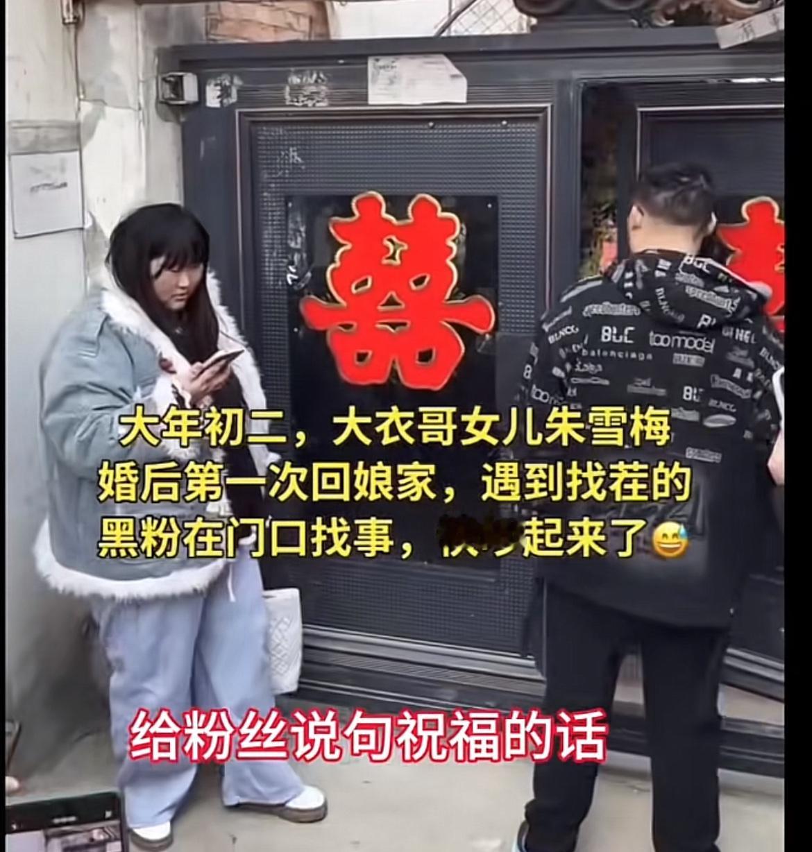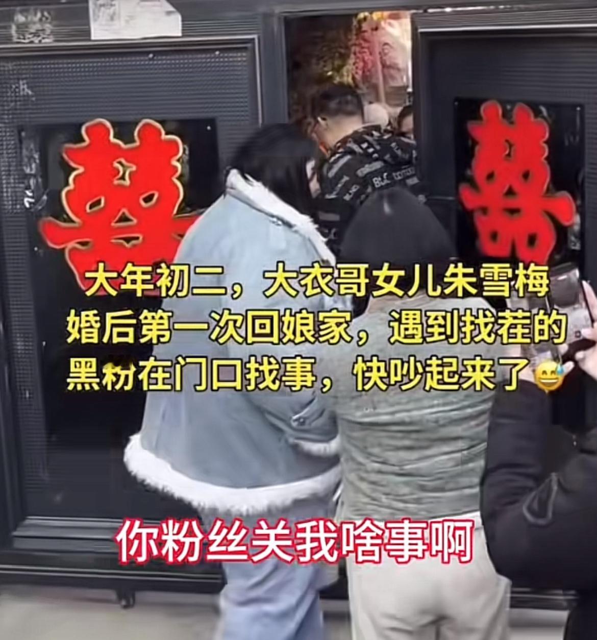 “你粉丝关我啥事儿!”山东菏泽,大衣哥新婚的女儿回娘家了,小夫妻在家门前遭遇粉丝围堵,让她给粉丝说句祝福的话,朱雪梅一句话怼回去。 真是人怕出名猪怕壮,大衣哥出名后,家门口就没清净过,正月初二,大衣哥的女儿朱雪梅,跟新女婿一起,小两口开着新车,拉着一后备箱的礼物,风风光光地回娘家。 家门口围了很多粉丝,朱雪梅都不敢输大门的密码,怕再泄露出去,只能站在门口给家人打电话,让他们把大门打开。 这时有人提出,让朱雪梅跟粉丝说句祝福的话,朱雪梅说了一句“你粉丝关我啥事儿”,就头也不回地进了娘家的大门。 有人说,怼得好,大过年的堵人家门口,这帮人闲得没事干了吧,搁谁都得烦。 也有人认为,朱雪梅没有必要这么说,就顺势而为,祝大家新年快乐,一句话的事儿,皆大欢喜。 你认为朱雪梅做的对吗?