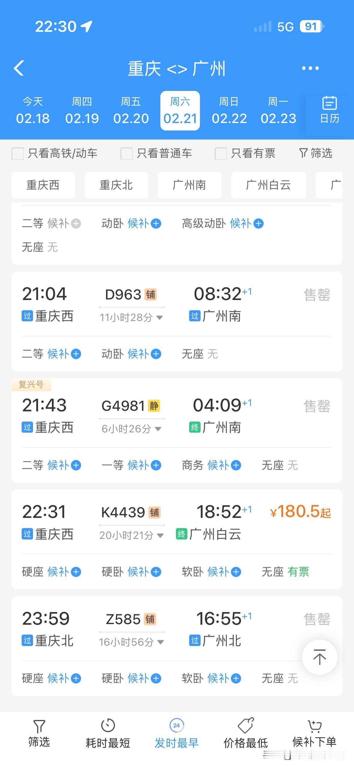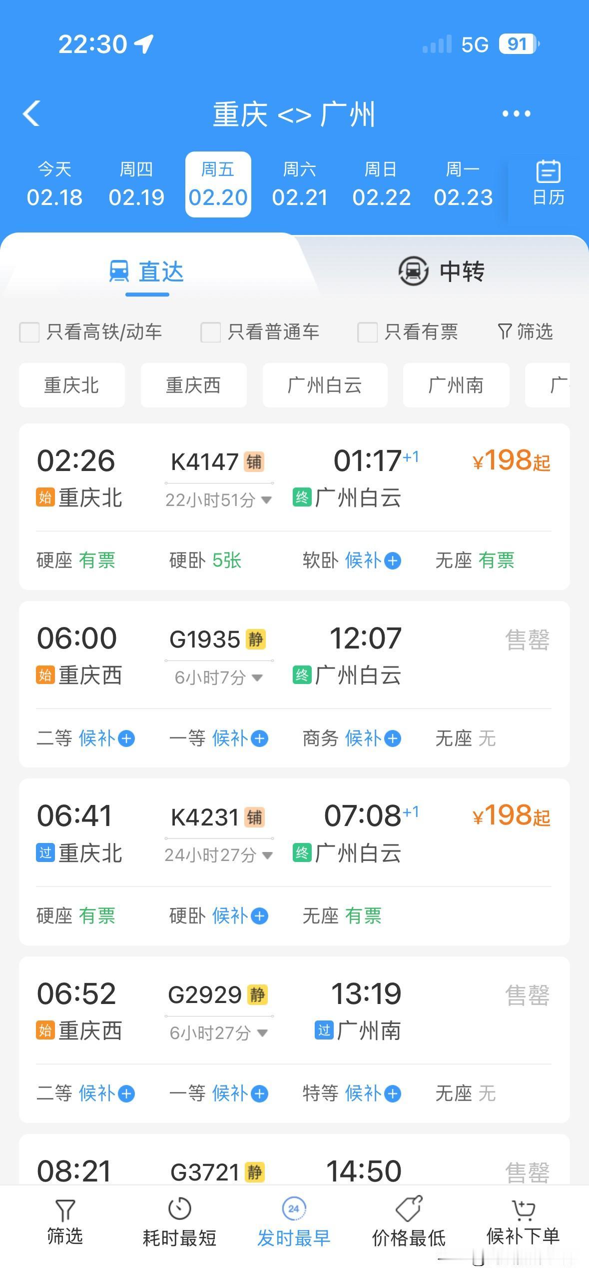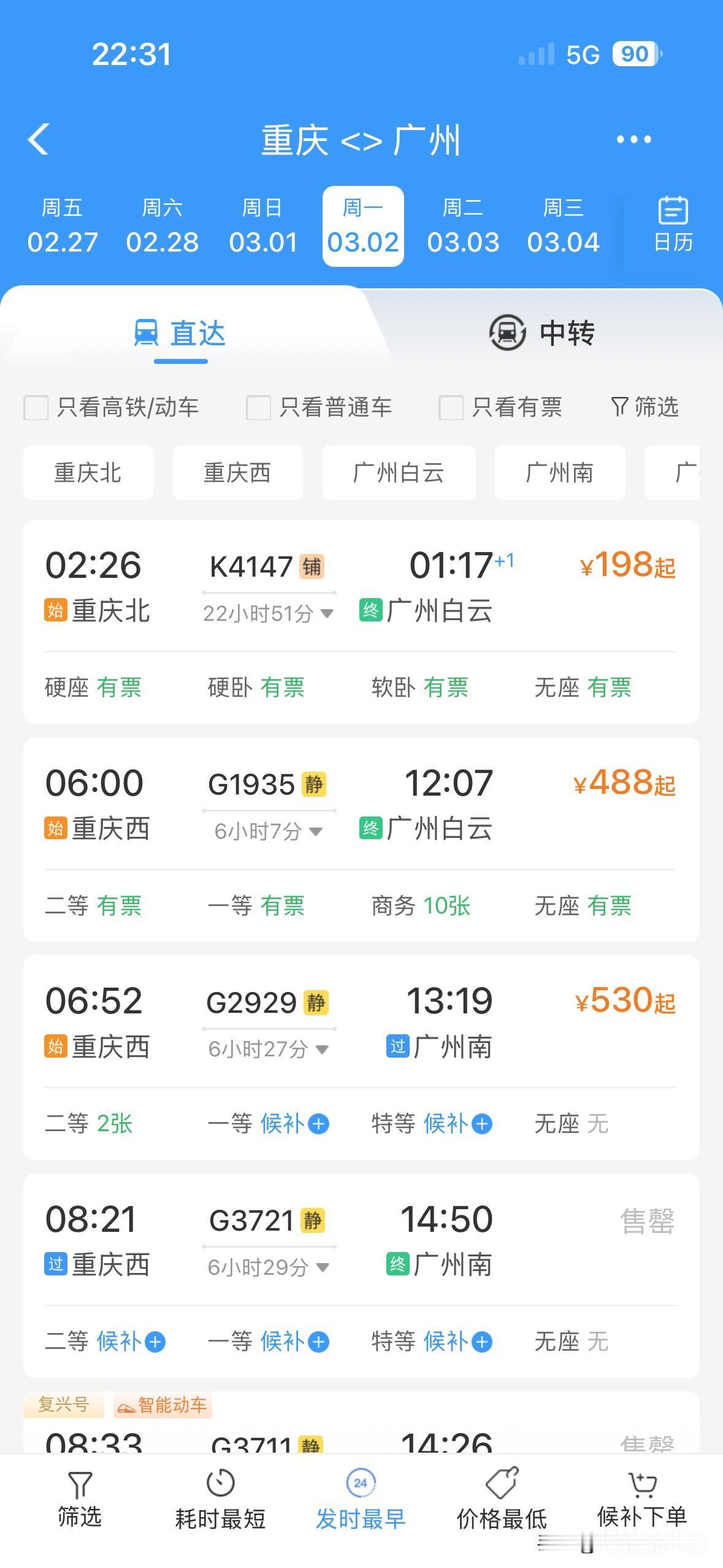 太吓人了!2月21日到3月1日,重庆到广州的火车票,几乎全部售罄,偶尔有零星的站票或者商务座……真没想到,大年初五到元宵节之前,重庆到广州,如此火爆! 可是,春节前,2026年春运,广东省珠三角没有出现史诗级超级大堵车,广东回乡的火车票也比较好买! 但是,2026年春运,返程的火车票,真的是太火爆了啊!万万没想到啊! 看来,春节后,大家还是很想去广东干活赚钱的啊!