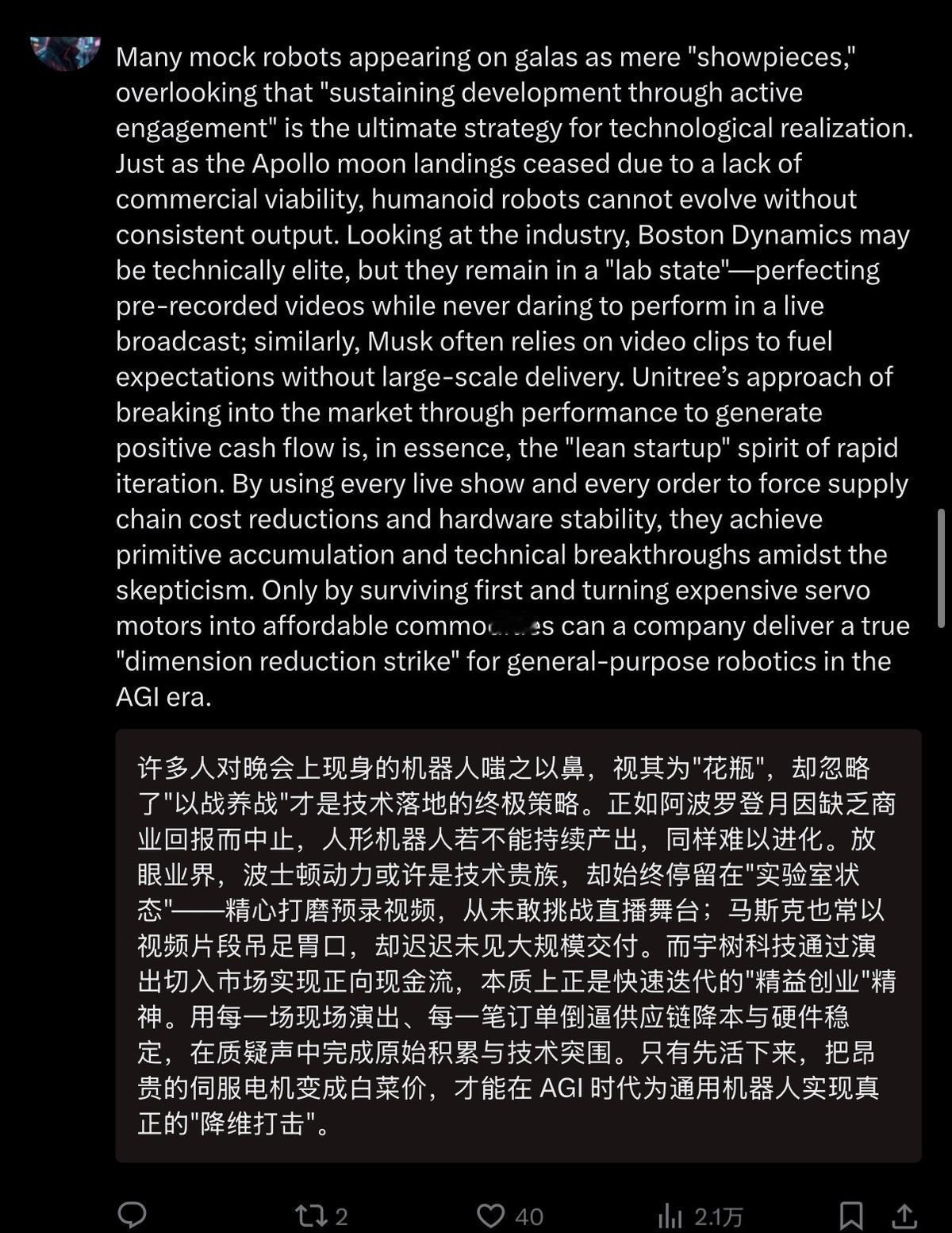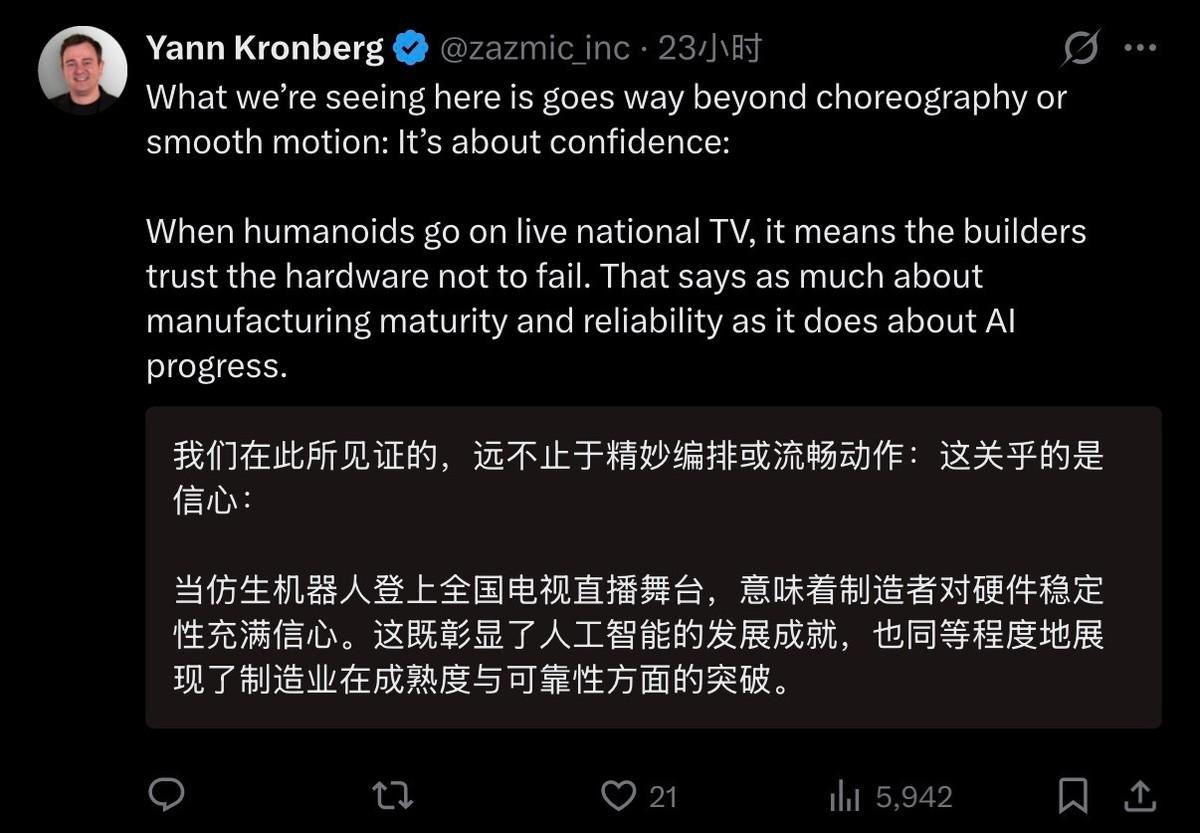 2天了,外国人还在讨论春晚上的机器人。尤其是美国和日本的网民,看起来已经破了大防。 先看美国网友的奇葩操作,但凡有春晚机器人的视频下面,总能看到他们满屏的质疑,翻来覆去就问两句话:这到底是真的机器人,还是AI特效做出来的?这些机器人能不能回家打扫卫生、洗碗做饭、修理汽车家电? 一边是不敢相信自己的眼睛,拿着放大镜逐帧扒视频,非要找出后期合成的痕迹,硅谷的工程师都出面拆解了运动参数,证明中国机器人的动态稳定性、集群控制能力全面领先,他们还是不愿意接受现实; 另一边是天真得可爱,满脑子想着家用服务,压根没意识到咱们的机器人早就不只是舞台花架子,工业生产、救援巡检、商用服务早就全面落地了。 有意思的是美国网友的嘴硬,明明自家机器人被甩了一大截,非要把波士顿动力搬出来撑场面,一口一个“我们实验室里的机器人比这牛多了”,还信誓旦旦地说“要不了多久,美国肯定能超过中国”。 这话听着就好笑,波士顿动力的Atlas机器人确实能耍帅、能后空翻,可折腾了这么多年,至今还停留在实验室演示阶段,造价高达上百万人民币,别说量产商用,连规模化测试都做不到; 特斯拉的Optimus更不用说,还在学走路的阶段,连基本的动作协调都没搞定,预计2027年才能勉强发售,售价还高得离谱。 再看看咱们中国的宇树机器人,春晚舞台上两百多台自主协同表演,武术空翻、集群变阵零失误,没有任何特效、没有远程遥控,核心软硬件全是自研 2025年实际出货量就突破5500台,2026年计划出货1-2万台,售价只要几千美元,成本只有美国机器人的零头,早就走进工厂、走进市场,实现了商业化落地。 一边是实验室里的花瓶,一边是遍地开花的实用产品,谁强谁弱,一目了然,美国网友的嘴硬,不过是自欺欺人罢了。 再看日本网友,直接陷入了深深的焦虑和后悔,画风和美国网友完全不同,满屏都是危机感。 他们直言不讳地说,三十年前,全世界都坚信日本能做出顶尖的人形机器人技术,可日本偏偏把资金、精力都投到了动画片、娱乐产业上,错过了技术落地的黄金时期; 现在中国不仅掌握了核心技术,还能以极低的价格量产,打造出规模化的“机器人大军”,日本根本没有赢的可能。 日本网友的清醒,恰恰戳中了日本机器人产业的痛处,曾经的日本是当之无愧的“机器人之国”,本田ASIMO、软银Pepper都是行业标杆,可如今ASIMO因成本太高、无法量产被迫停摆,Pepper故障频发彻底退出市场,川崎重工的救灾机器人还要靠轮椅登场,曾经的辉煌早已烟消云散。 反观中国,从伺服电机、减速器到AI算法、控制系统,全产业链自主可控,不仅技术领先,更有全球最完善的制造业体系支撑,机器人从研发到量产的速度,让日本望尘莫及,这种落差带来的焦虑,让日本网友彻底破防。 要我说美日网友的集体破防,本质上是接受不了中国科技的跨越式崛起,接受不了曾经被他们看不起的中国智造,如今已经实现了弯道超车、领跑全球。 可咱们的机器人,不是为了炫技,不是为了炒作,而是扎根于民生、服务于产业,春晚的表演只是冰山一角,工厂里的精准作业、废墟里的救援探路、生活中的服务保障,才是中国机器人的真正价值。 宇树科技的机器人关节模组成本只要800元,不到进口产品的六分之一,双足行走误差控制在0.5毫米,能满足手机主板装配的精密要求,这种性价比和实用性,是美日机器人永远比不了的。 说到底,看着美日网友的酸言酸语,我们不仅不生气,反而觉得格外解气。 我们不用跟谁攀比,不用在意谁的嘴硬,只用实力说话,用成果证明。 那些曾经看不起我们的人,如今只能在屏幕前羡慕、焦虑、破防;那些曾经卡我们脖子的技术,如今我们早已实现自主可控、全面领先。 历史已经证明,也必将继续证明,投机取巧走不远,嘴硬逞强没用处,只有脚踏实地、自主创新,才能真正屹立于世界科技之林。 春晚机器人让美日网友破防,只是中国智造崛起的一个缩影,未来还会有更多的科技成果惊艳世界,让那些心怀偏见的人,彻底认清现实、收起酸葡萄心理!