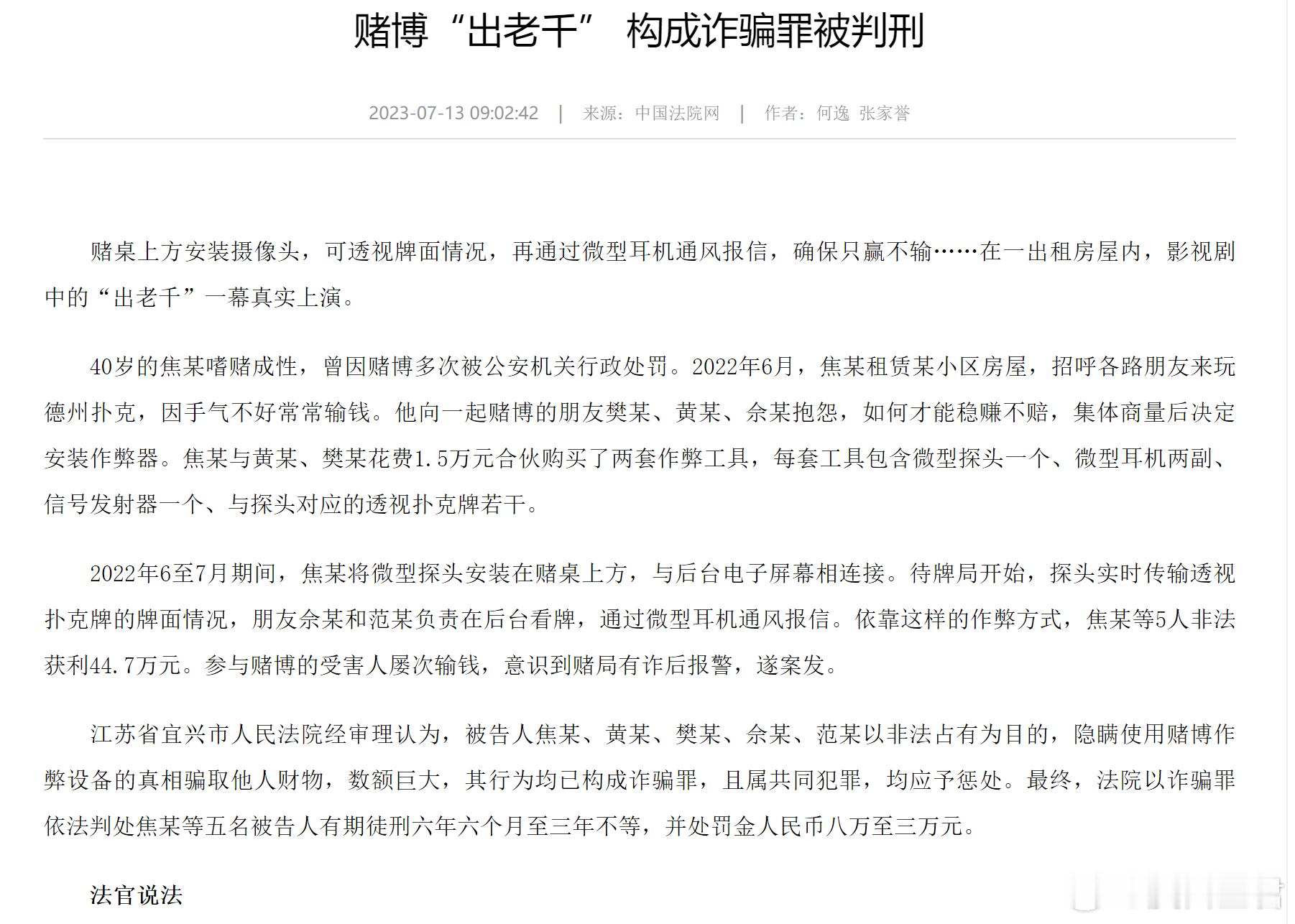 为使骗局更逼真,周某乙另招募多人组成“气氛组”,在牌桌上配合切牌、抬高押注,刺激唐先生加大赌注。事成后,赃款通过周某甲女友账户收取并瓜分,“气氛组”成员则按次领取报酬。2023年9月至2024年1月期间,该团伙通过5次赌局共骗取唐先生175.12万元,其中60万元诈骗未遂。最终定的是诈骗罪,判处被告人周某甲等人有期徒刑十二年至三年不等,并处罚金。我们再看一个“出老千”的赌博: