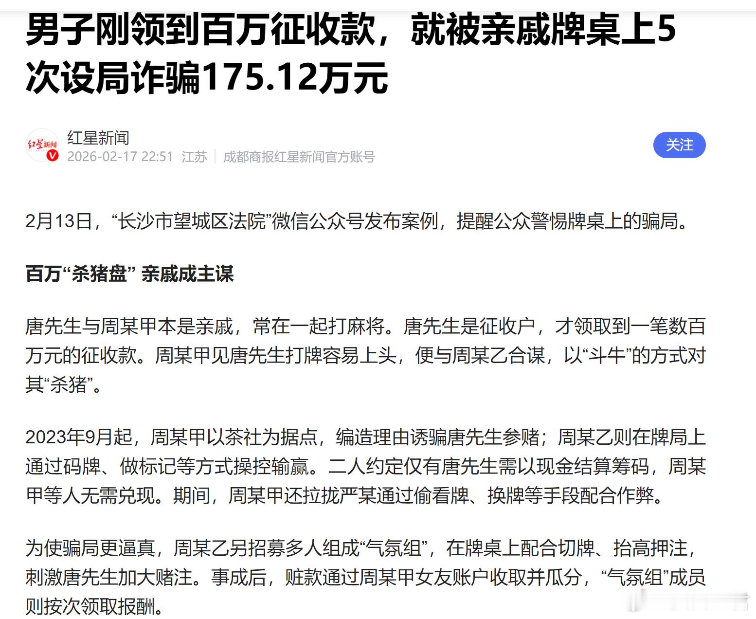 本新闻事件中,犯罪人通过制定复杂规则、暗号通牌、相互喂牌做大牌型等方式操控牌局,其做法并非基于赌博赚钱,而是完全通过欺骗来赚钱,定诈骗罪是没有问题的。我们再来看一个以赌博为名,实际诈骗的案例:2023年9月起,周某甲以茶社为据点,编造理由诱骗唐先生参赌;周某乙则在牌局上通过码牌、做标记等方式操控输赢。二人约定仅有唐先生需以现金结算筹码,周某甲等人无需兑现。期间,周某甲还拉拢严某通过偷看牌、换牌等手段配合作弊。