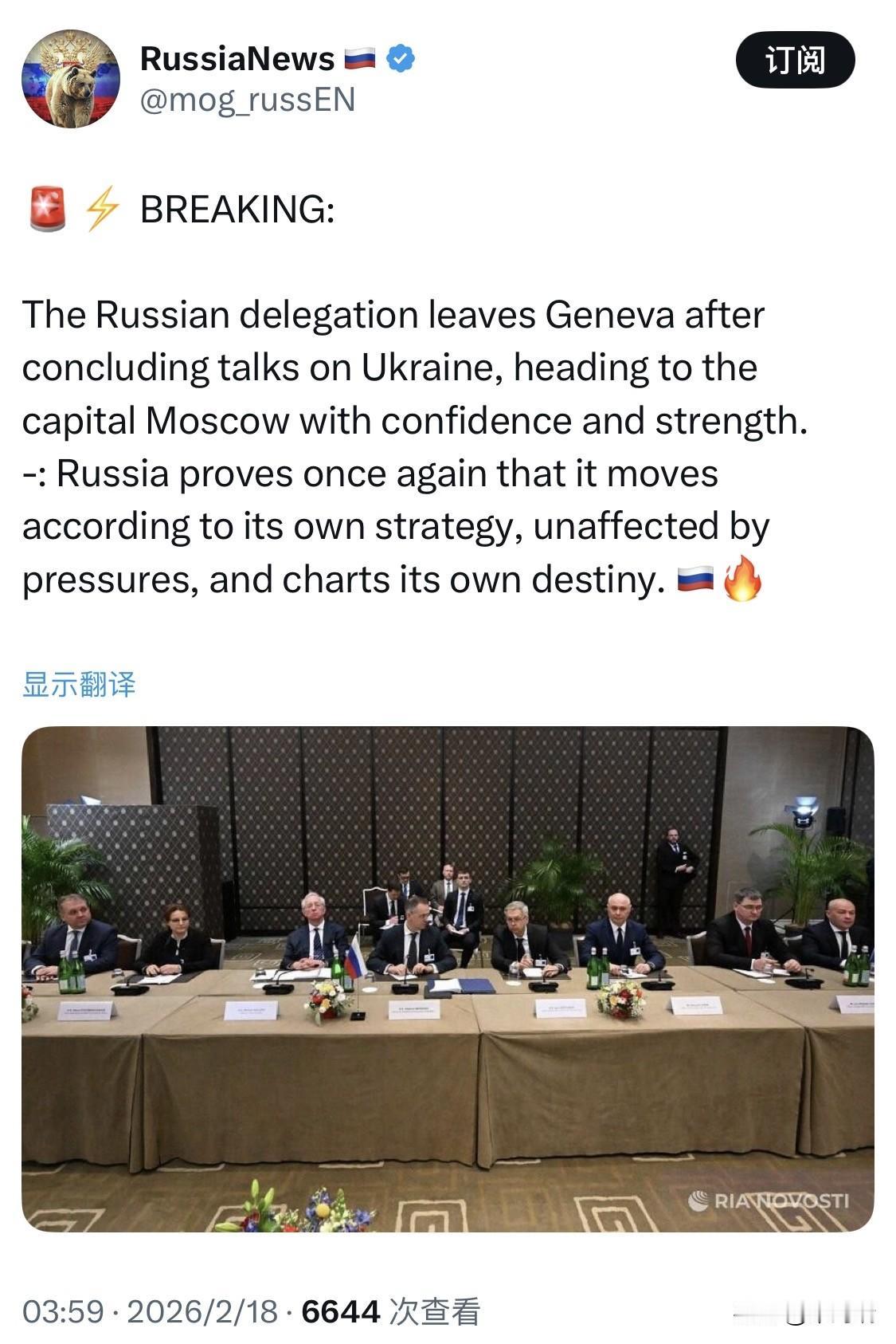 突发新闻:俄罗斯代表团在结束乌克兰问题会谈后离开日内瓦,信心满满地前往首都莫斯科。 俄罗斯再次证明,它按照自己的战略行事,不受任何压力影响,并掌握着自己的命运。