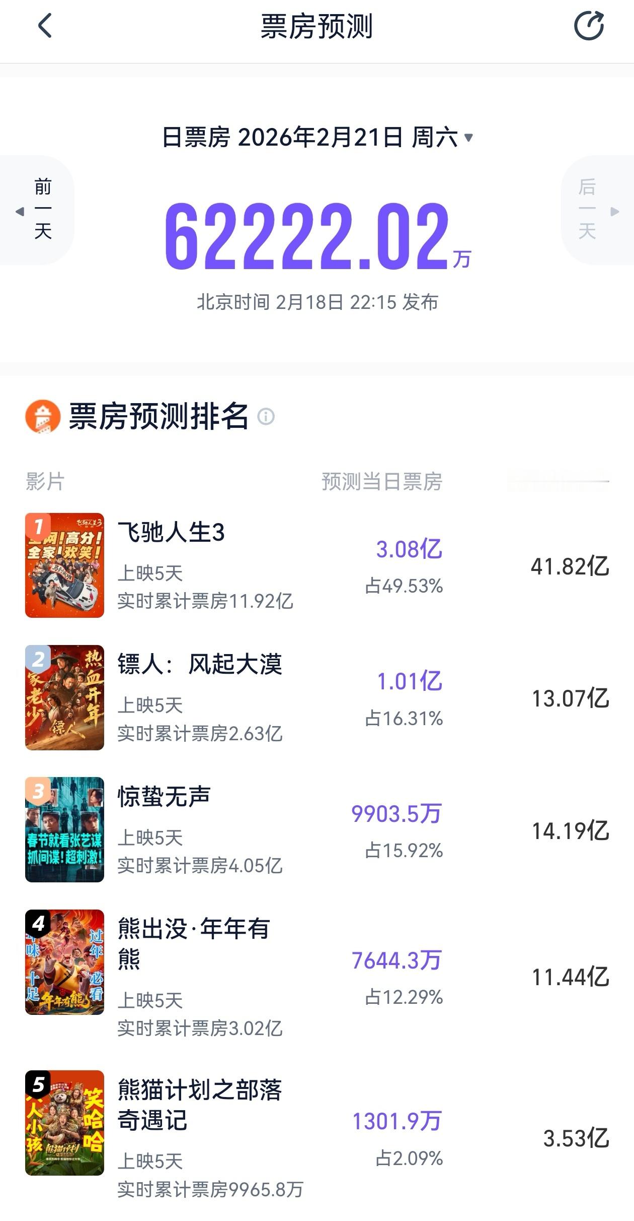 另外,灯塔专业版对《飞驰人生3》的预测,目前是到2月21日总票房达到41.82亿元,若该电影后面几天有超过预期的票房成绩,最终票房估计还要上涨,反之则达不到40亿元,但2026春节档票房冠军,应该是肯定的,毕竟同期没有更能打的了。春节档总票房已破22亿