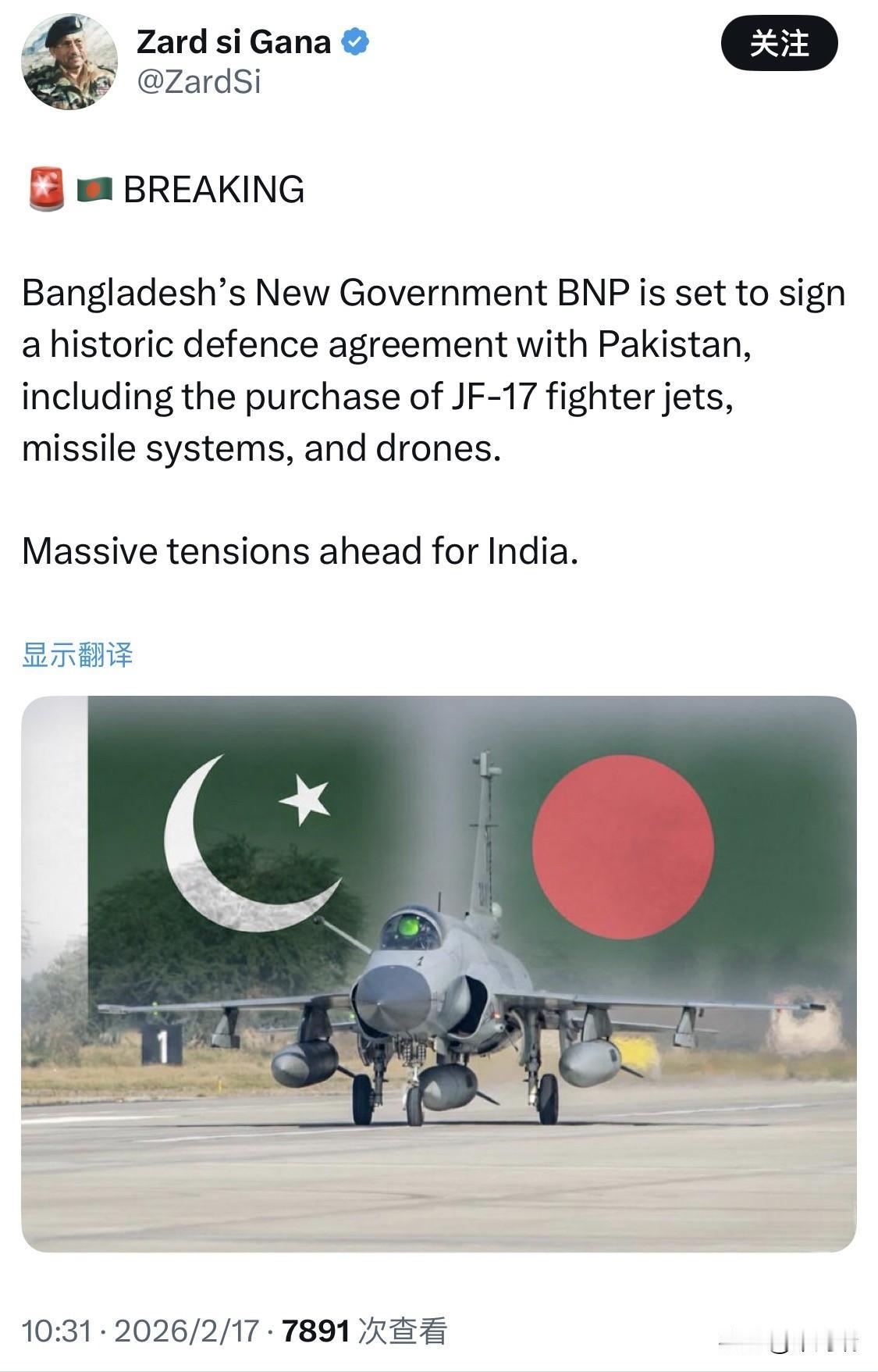 突发新闻:孟加拉国新政府即将与巴基斯坦签署一项历史性的国防协议,其中包括购买JF-17战斗机、导弹系统和无人机。 印度将面临巨大的紧张局势。