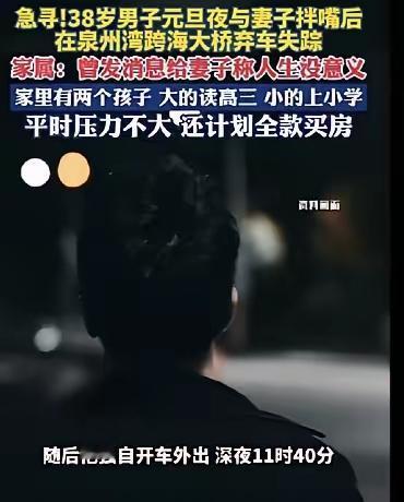 压倒骆驼的最后一根稻草!福建泉州,一38岁男子回到家里,立刻就想上床休息,谁知被妻子拦住,要他先洗脚再上床,为了这点小事,俩人发生了吵架,男子一气之下,开车来到了跨海大桥,他打开双闪,将车停在应急车道,他给妻子发了条消息:“人生没有意义!”又给妻子妹妹发了条消息:“妻子就交给你照顾了!”妻子急了,赶忙给他回拨电话,可电话无人接听,警方赶到了现场,发现男子手机等随身物品都放在车里,人却不见了踪迹。 很多人看到这件事的第一反应,都会觉得不就是洗个脚吗,至于走到这一步。只有真正走进中年人的生活,才会明白这看似微不足道的争执,根本不是矛盾的起点,而是长期压抑之后彻底崩溃的爆发。这名38岁男子在泉州当地一家工厂做技术员,每天工作时长超过12个小时,流水线作业强度大,精神时刻紧绷,下班回家时早已身心俱疲。 他上有年迈父母需要赡养,下有正在上学的孩子,每个月房贷、车贷、家庭日常开支像一座座大山压在身上。为了多赚点钱,他主动申请加班,节假日也很少休息,几乎把所有时间都投入到工作中。他不敢生病,不敢请假,不敢抱怨,在家人面前一直强撑着坚强的样子,把所有压力和疲惫都藏在心里。 事发当晚,他拖着酸痛的身体回到家,唯一的念头就是躺下来休息几分钟。妻子让他先洗脚再上床,在平日里本是一句再正常不过的叮嘱。可在那一刻,长时间积累的劳累、委屈、焦虑瞬间涌上心头,他控制不住自己的情绪,和妻子发生了争吵。 争吵的内容无关洗脚,而是他觉得自己拼命支撑家庭,却得不到理解,是他觉得人生看不到尽头,是所有说不出口的压力在这一刻全部爆发。他开车驶上跨海大桥,沿途的风景没有让他平复心情,反而让他对生活彻底失去希望。 他留下的两句话,一句是对人生的绝望,一句是对妻子最后的牵挂。短短几行字,藏着一个中年男人走投无路的心酸。妻子看到消息后瞬间崩溃,她从来没想过一句平常的叮嘱,会引发这么严重的后果。她拼命拨打丈夫电话,每一次无人接听都让她更加恐慌,她这才意识到,自己忽略了丈夫长期以来的疲惫和压抑。 警方接到报警后,立即调集警力和救援设备在跨海大桥及周边水域展开搜寻。岸边的监控显示,男子停车后独自走上桥边,之后便失去了踪影。救援人员连夜搜寻,不放过任何一个角落,家人在岸边焦急等待,泪水止不住地流,他们满心希望能出现奇迹,盼着男子只是一时想不开,能够平安回来。 这件事在当地引发了大量关注,无数网友看完之后心里发酸。大家都在感慨,中年人的世界从来没有容易二字,外表看似平静,内心早已千疮百孔。很多人都在男子身上看到了自己的影子,为了生活咬牙坚持,不敢倒下,不敢放松,不知道哪一件小事,就会成为压垮自己的最后一根稻草。 我们总习惯用小事去定义一场崩溃,却很少有人愿意去看崩溃之前,那个人到底承受了多少不为人知的重量。家人之间最需要的不是挑剔和要求,而是理解和心疼,多一句关心,少一点指责,或许就能避免一场无法挽回的悲剧。 人生从来都不容易,对身边的人多一份体谅,就是对生活多一份温柔。 各位读者你们怎么看?欢迎在评论区讨论。
