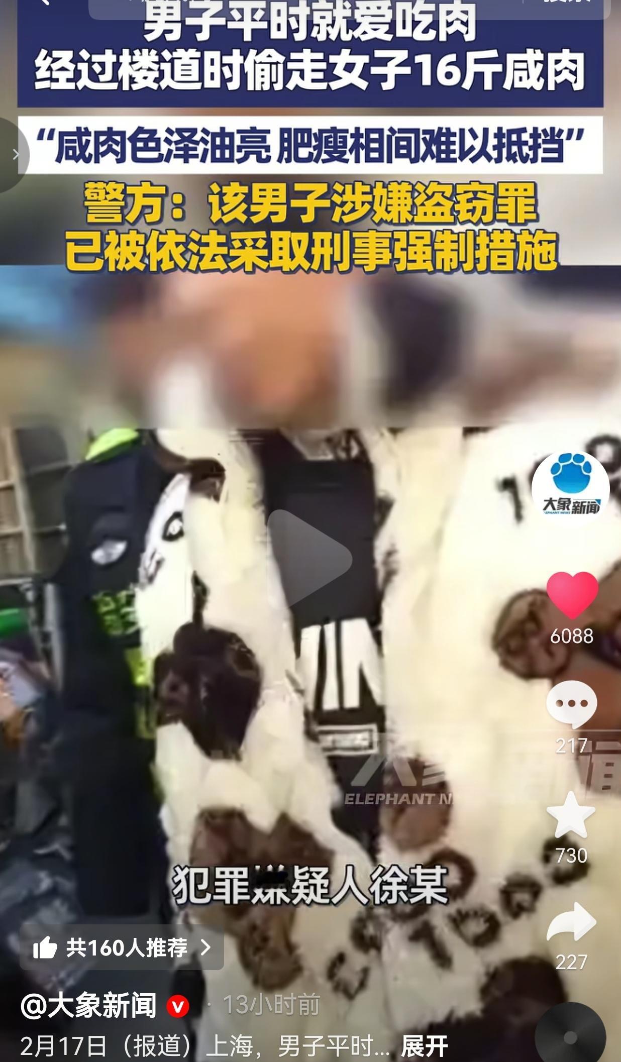 因为16斤咸肉,把自己弄得锒铛入狱,这不是害人害己吗?上海的沈女士,年前在楼道晾了整整16斤咸肉,油亮油亮的,肥瘦相间,一看就是花了不少心思腌的。就等着年夜饭端上桌,给全家添点年味。 可谁能想到,年还没过,肉先没了。 偷肉的是个姓徐的男子,据了解他可不是第一次干这种事了,有多次盗窃的违法前科,平时就爱吃肉。 那天路过沈女士家楼道,一眼瞅见那几大块色泽油亮、肥瘦相间的咸肉,色香勾人,实在没抵住诱惑,脑子一热,顺手就把16斤肉全拎走了。 沈女士发现肉没了,又气又急,立马报了警。民警很快锁定了徐某,把他抓了。 审讯时,徐某还在为自己辩解,说自己就是“没抵住诱惑”,看着那肉太香,一时糊涂才犯了错。 可他没想到,这一“顺手”,直接把自己送进了刑事强制措施的名单里。 因为多次实施盗窃行为,警方通报他涉嫌盗窃罪,目前已被依法采取刑事强制措施,这下年是过不好了,家里人也跟着揪心。 网友看到后评论道: “这肉是有多香?香到连法律都不顾了?还是说,偷东西已经成了他改不掉的习惯?” 也有的网友说:“16斤肉,值不了多少钱,可这代价也太大了。有前科还不改,这是真的没把法律当回事啊。” 还有的网友说:“我家也晾了咸肉,现在赶紧收进屋里了……这年头,连年货都得防着点。” 其实,徐某的“没抵住诱惑”,又何尝不是我们每个人都可能遇到的考验? 小时候,我们可能偷拿过家里的糖;长大了,可能在工作中动过“走捷径”的心思;甚至在感情里,也有过“忍不住”的瞬间。 区别在于,大多数人都能在最后一秒拉住自己,而徐某,却被那一口肉香,拖进了深渊。 更让人唏嘘的是,他不是初犯,而是“屡教不改”,这说明他心里的那道底线,早就被一次次的侥幸和贪婪磨平了。 16斤咸肉,就算按市场价算,撑死也就几百块钱。 可徐某付出的代价,是 留下案底,影响自己和家人的未来。 丢了脸面,在亲戚朋友面前抬不起头。错过了和家人团圆的春节,只能在冰冷的审讯室里反思。 所以,无论如何,这账,怎么算都亏。 我们总说“人为财死,鸟为食亡”,可真正聪明的人都懂:有些东西,比眼前的利益更重要。 那是做人的底线,是心里的规矩,是哪怕再饿、再馋,也不能伸手的尊严。尤其是有过前科的人,更应该明白,一次犯错可以被原谅,但屡教不改,只会把自己逼到绝路。 大家觉得呢?欢迎大家评论区讨论留言。