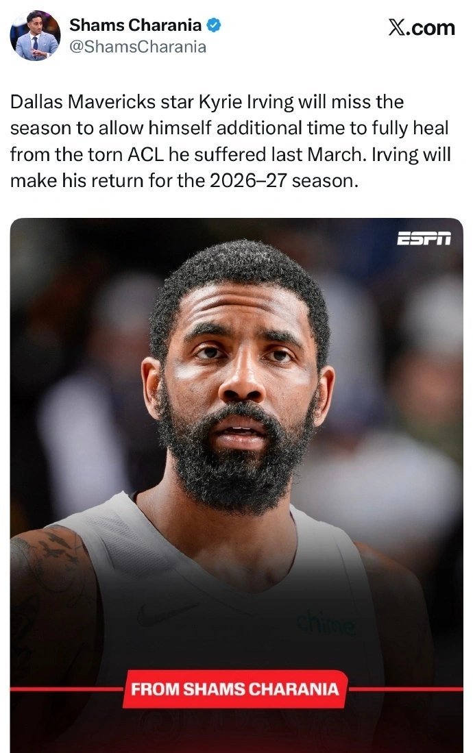 名记Shams报道表示欧文赛季报销,本赛季不会复出,随后独行侠官方确认,欧文将于2026-27赛季复出回归赛场。在独行侠交易送走浓眉哥后,本赛季已经确定继续重建,因而欧文复出已经没有意义。
