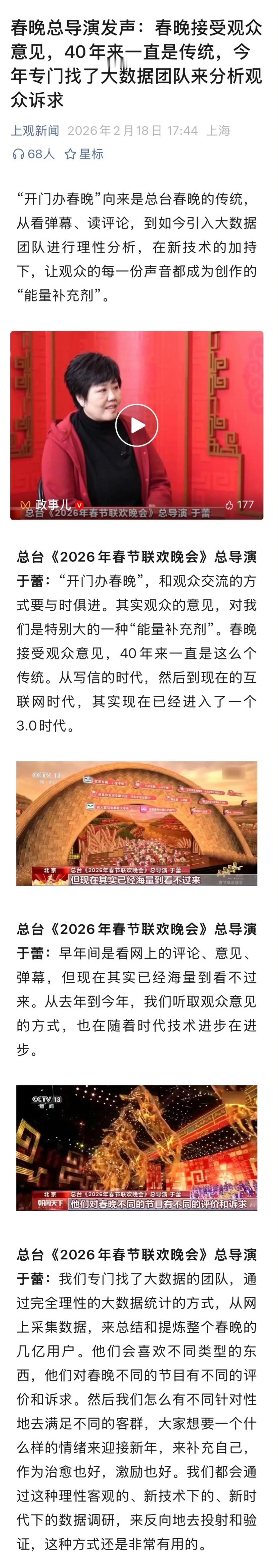 春晚总导演于蕾发声:春晚接受观众意见,40年来一直是传统,今年专门找了大数据团队来分析观众诉求。